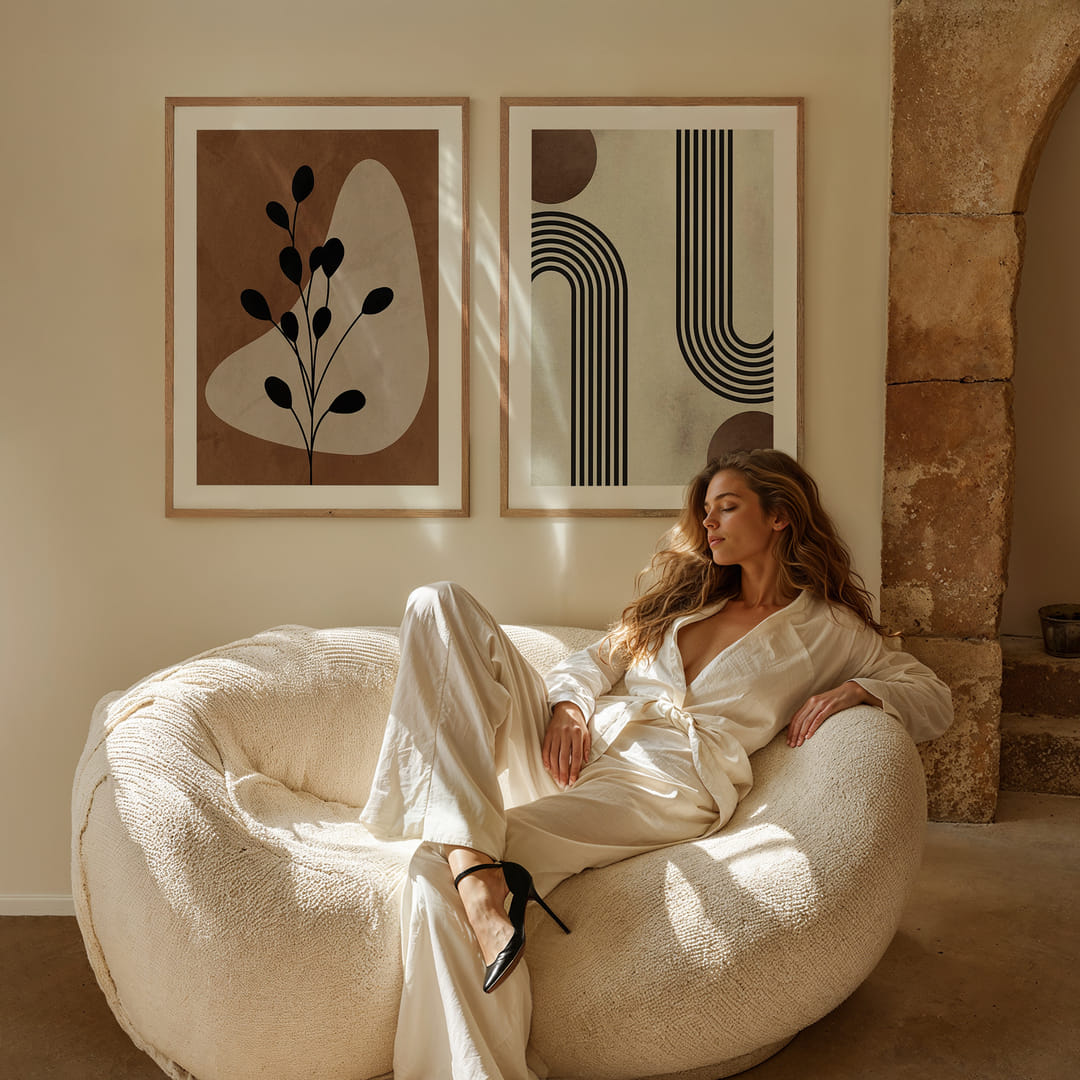 Tieto plagáty vytvárajú harmonickú rovnováhu medzi abstraktnými geometrickými tvarmi a jemnými botanickými líniami. S paletou zemitých tónov a elegantným rytmom vzniká pokojný a sofistikovaný výraz. Táto symbióza umeleckých diel dodáva modernú eleganciu, ktorá umocňuje atmosféru miestnosti a nabáda k zamysleniu a relaxácii.