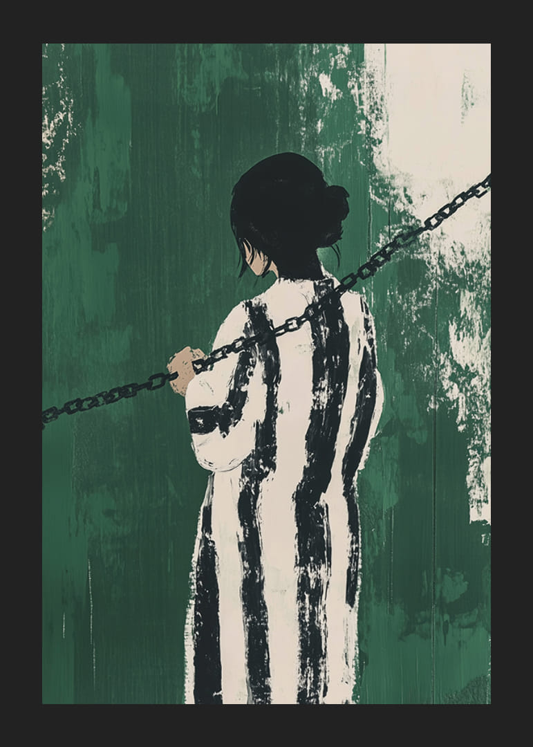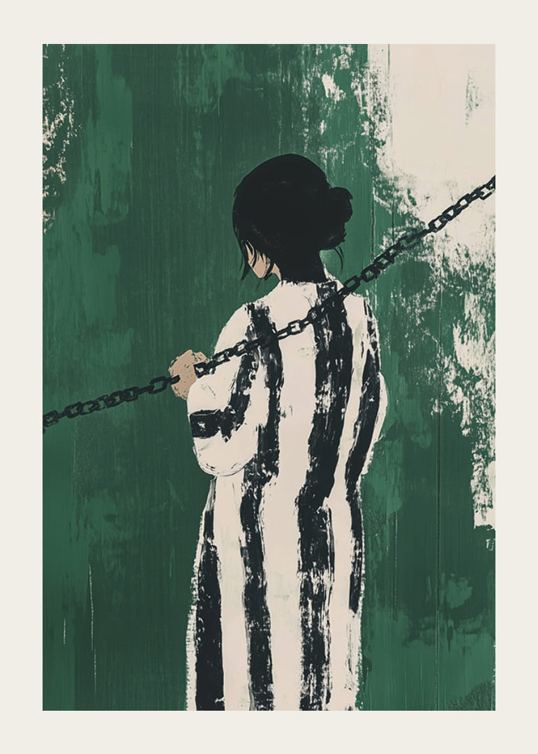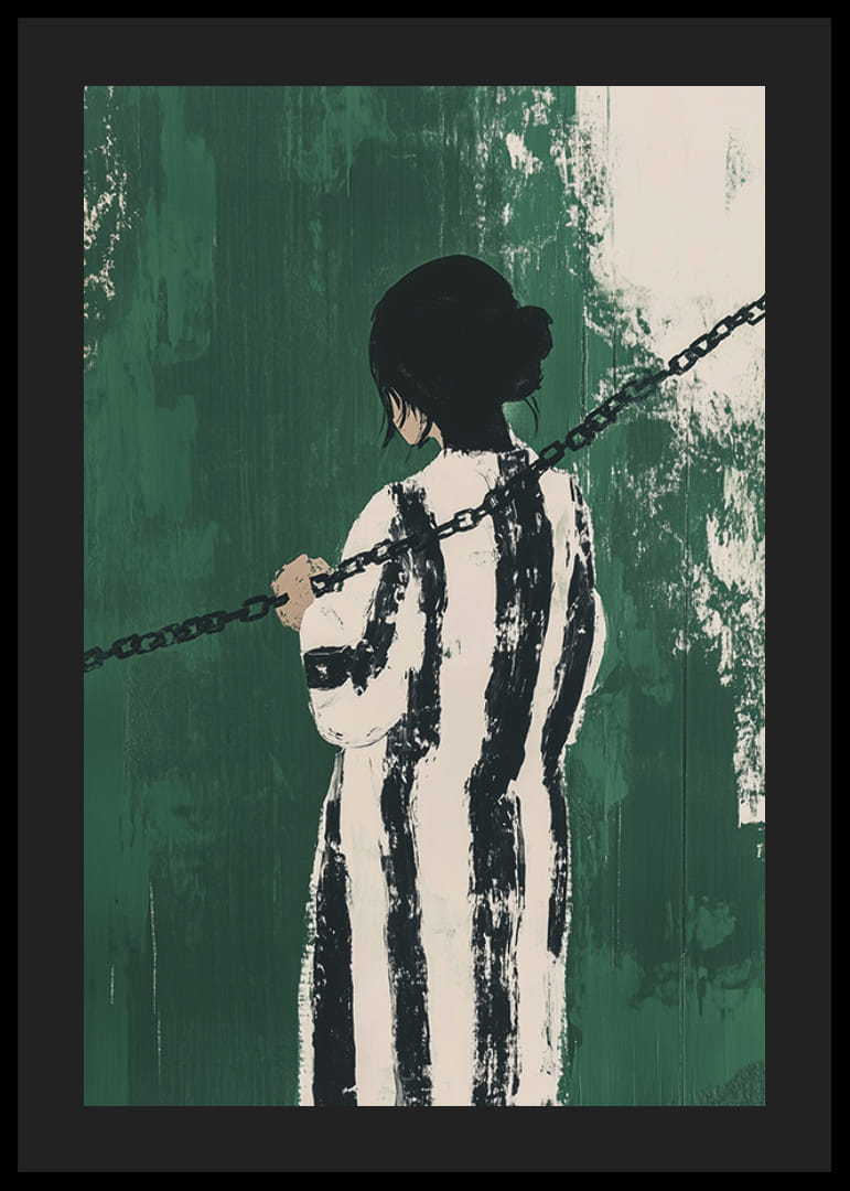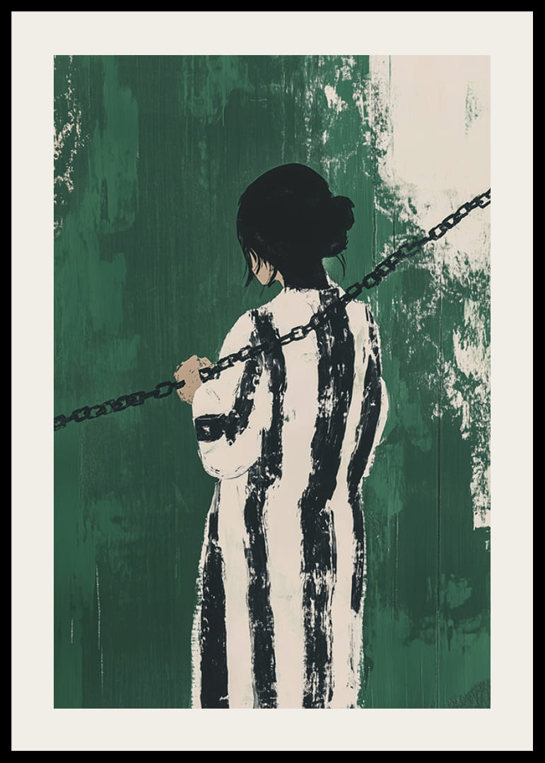 Tento plagát zachytáva silný zmysel pre tajomstvo a kontempláciu. Osamelá postava, obrátená smerom od diváka, je obalená čiernobielymi pruhmi a držaná v zajatí tmavými reťazami na intenzívnom zelenom pozadí.