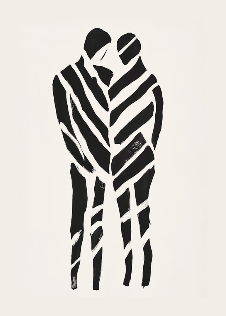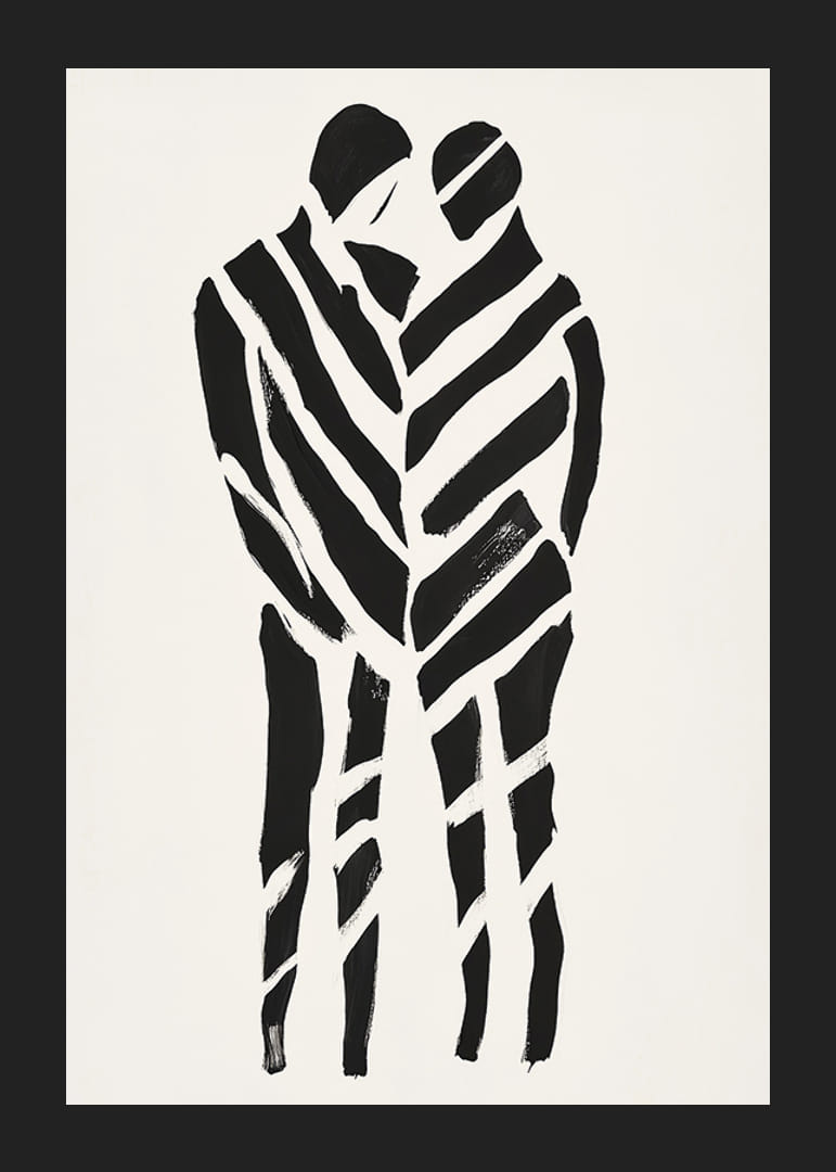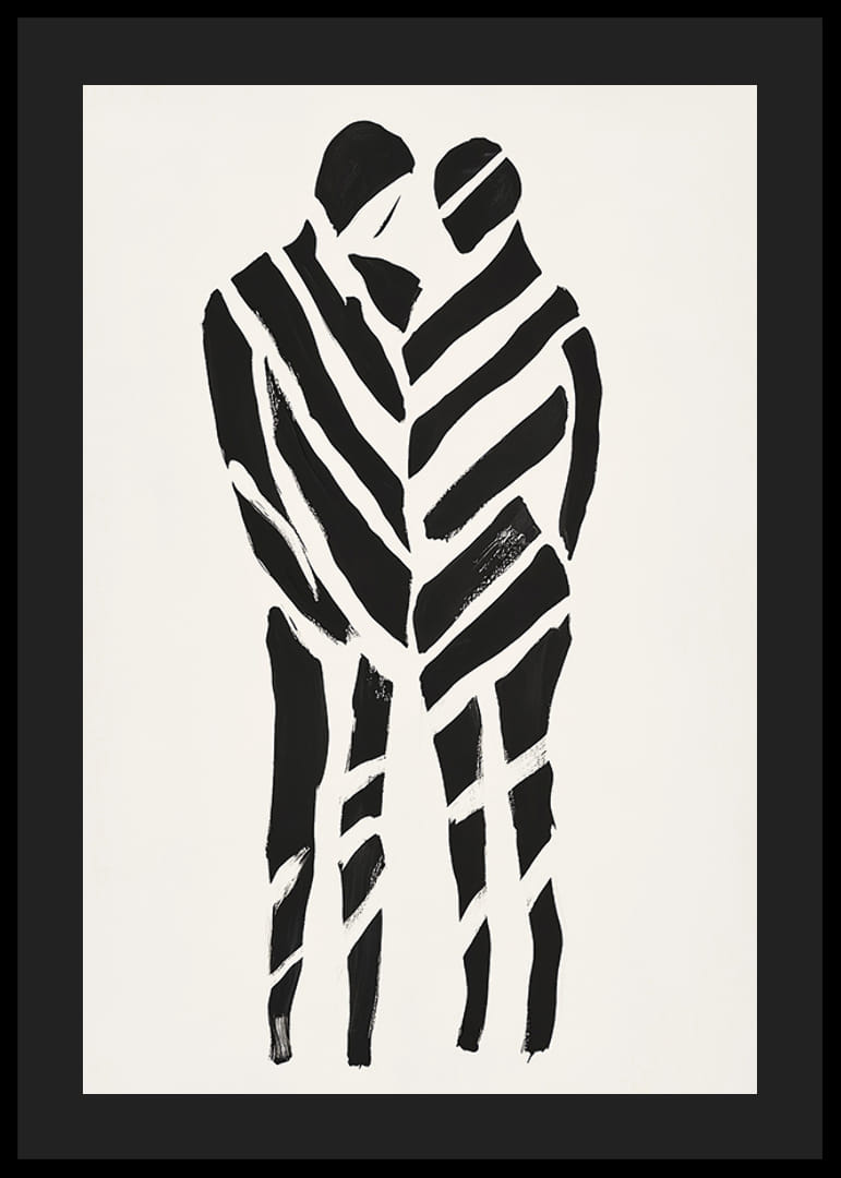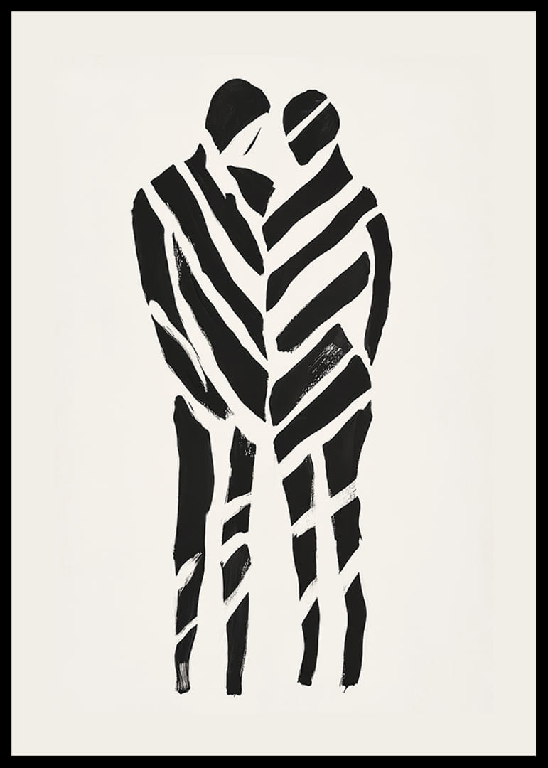 Tento plagát zachytáva intenzívny pocit blízkosti a spolupatričnosti. Svojimi výraznými čiernymi líniami na bielom pozadí vytvára dynamický kontrast, ktorý zvýrazňuje intímne objatie dvoch siluet.