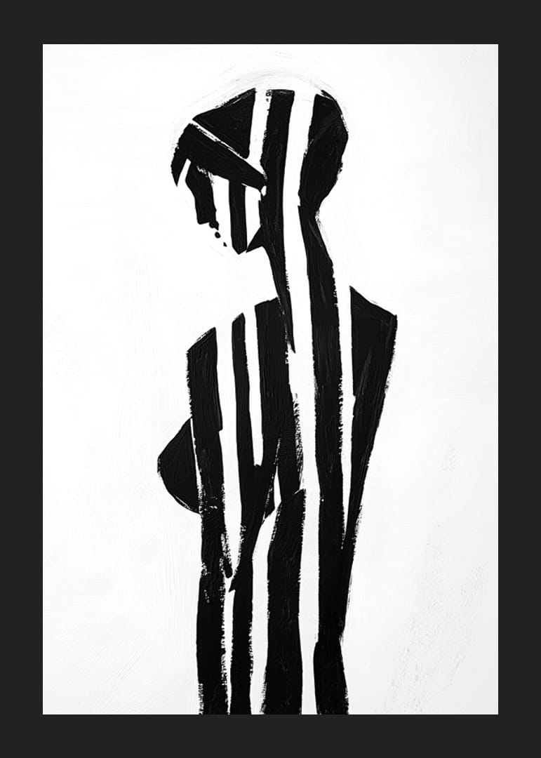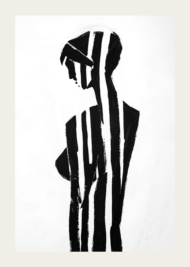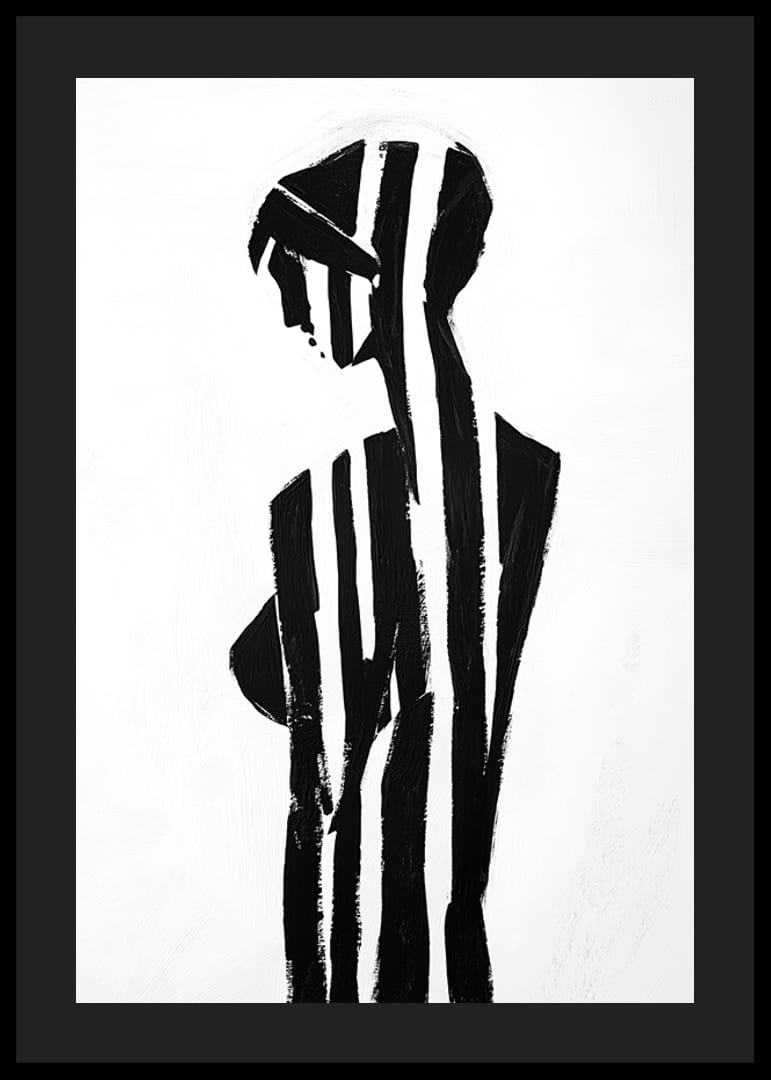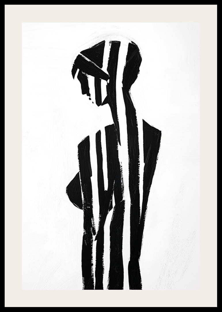 Tento plagát, na ktorom čierne a biele pruhy pôvabne formujú ženskú siluetu, obklopuje bezprostredný zmysel pre tajomstvo a eleganciu. Jednoduchý, ale silný kontrast medzi svetlom a tmou vyvoláva pocit hĺbky a introspekcie.