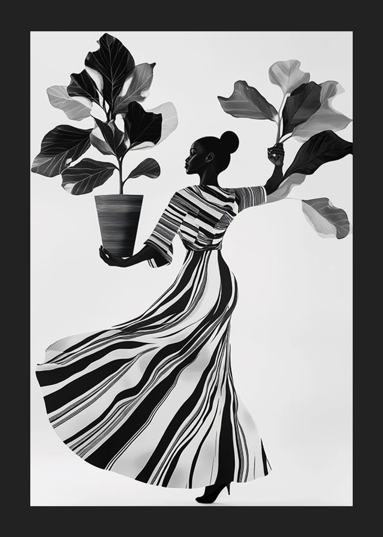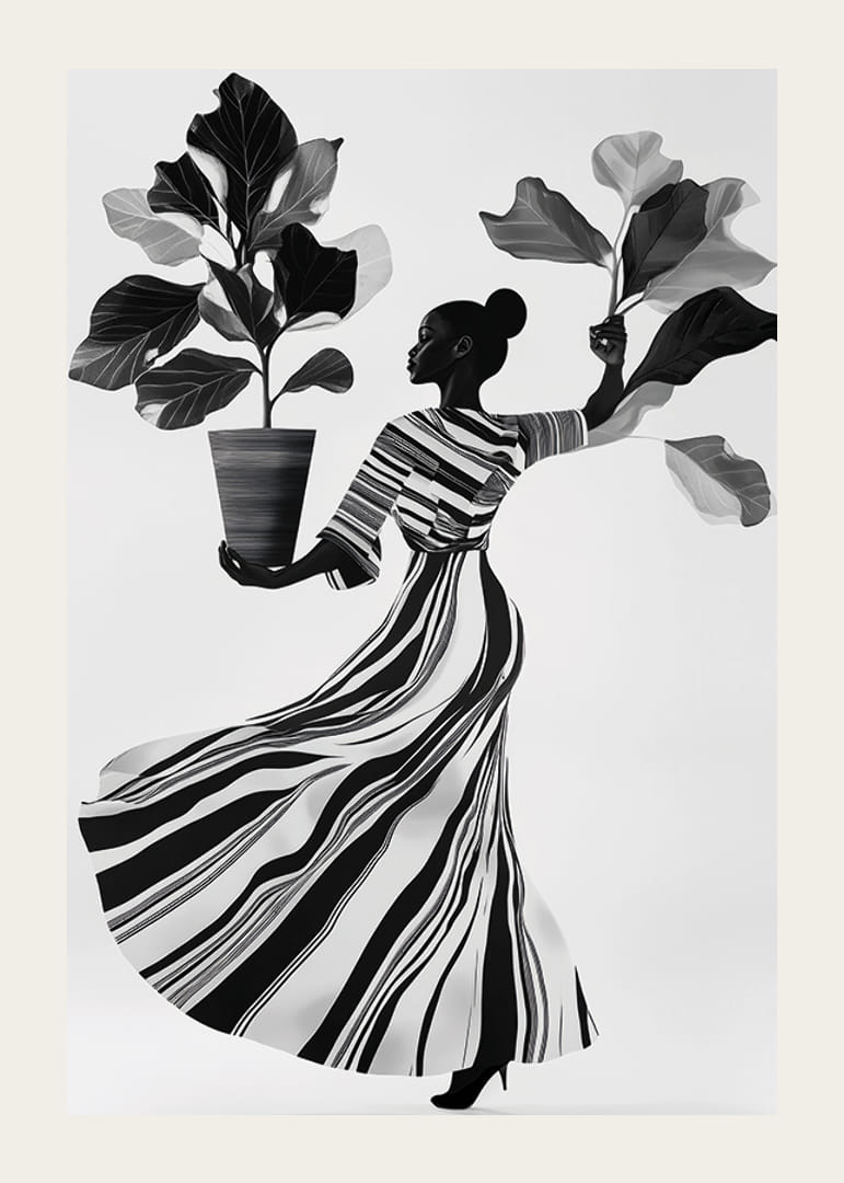 Tento plagát zachytáva podmanivú siluetu v čiernej a bielej farbe, kde sa forma a pohyb stretávajú v harmónii. Figúrka drží svieže rastliny a oživuje obraz svojím jemným kontrastom. Pruhovaný vzor šiat umocňuje splývavý a elegantný dojem, ktorý je umelecký aj štýlový.