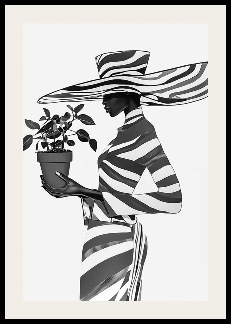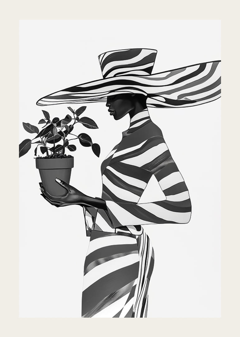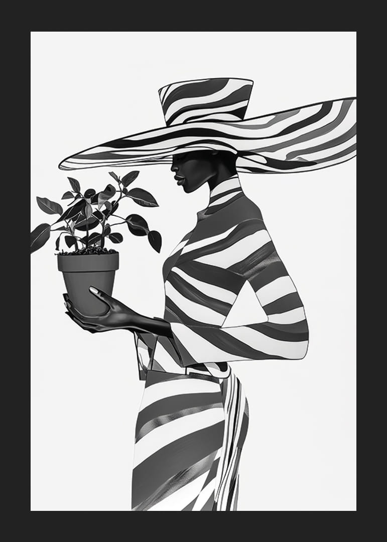 Tento plagát upúta elegantnou čiernobielou siluetou ženy s výrazným zebrím vzorom, ktorá v ruke starostlivo balansuje so zelenou rastlinou. Kontrast medzi výraznými grafickými líniami a živou zeleňou vytvára kreatívnu harmóniu.