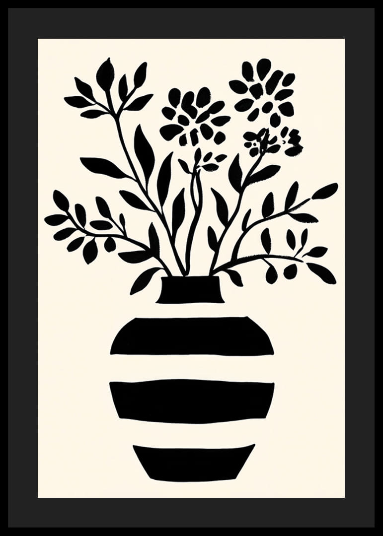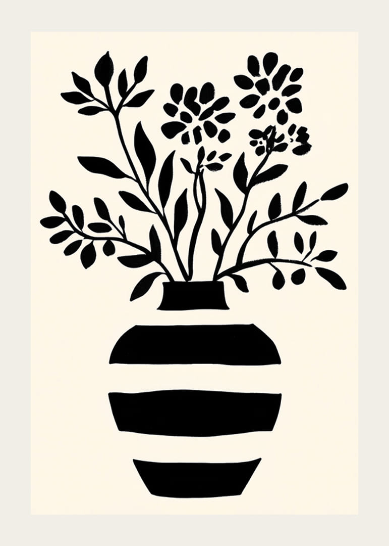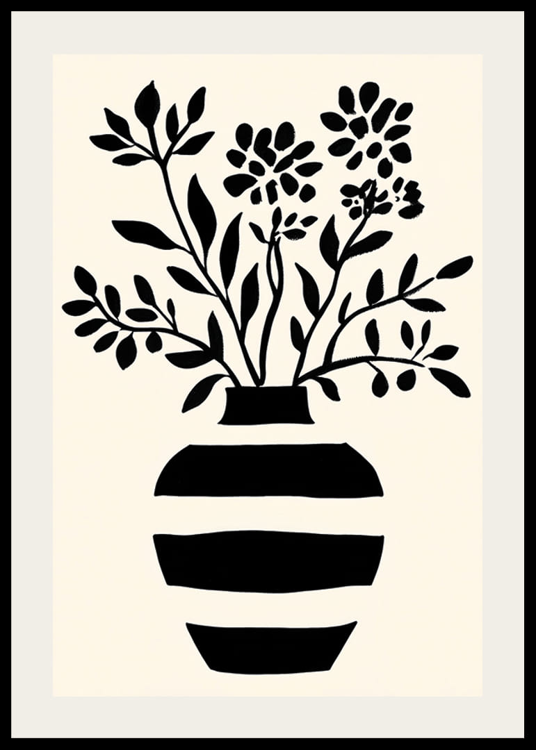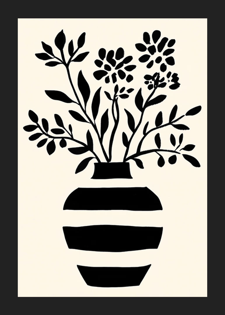 Tento plagát upúta pozornosť svojim jednoduchým, ale výkonným štýlom. Čiernobiela silueta kvetov vychádza z pruhovanej vázy a dodáva pocit nadčasovej elegancie. Minimalistický čiernobiely motív vytvára pokojnú atmosféru, ktorá je ideálna na dodanie sofistikovanosti do každej miestnosti.