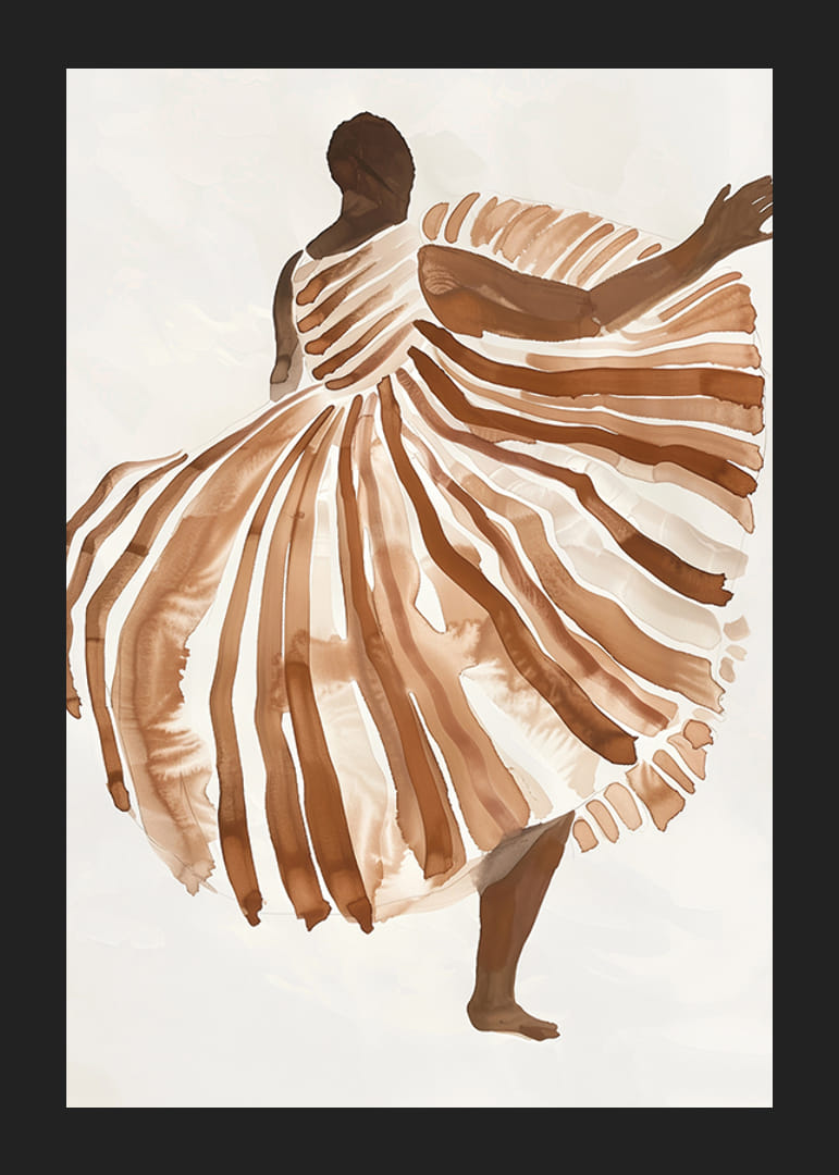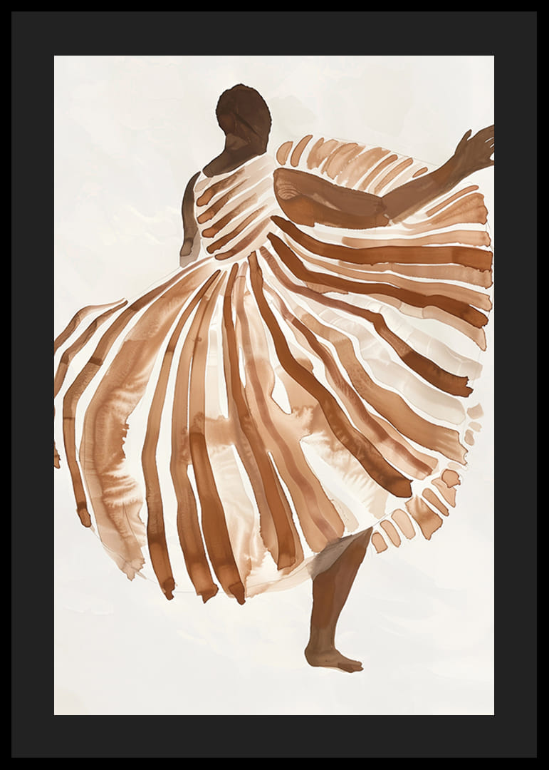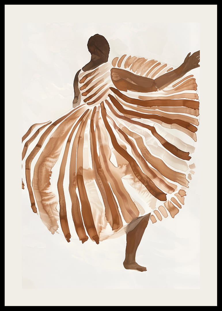 Tento plagát vyjadruje pocit slobody a pohybu prostredníctvom zobrazenia tanečnice zahalenej do teplých zemitých odtieňov. Jemné línie a pôvabné plynutie vzoru šiat vytvárajú vizuálnu harmóniu, ktorá fascinuje diváka.