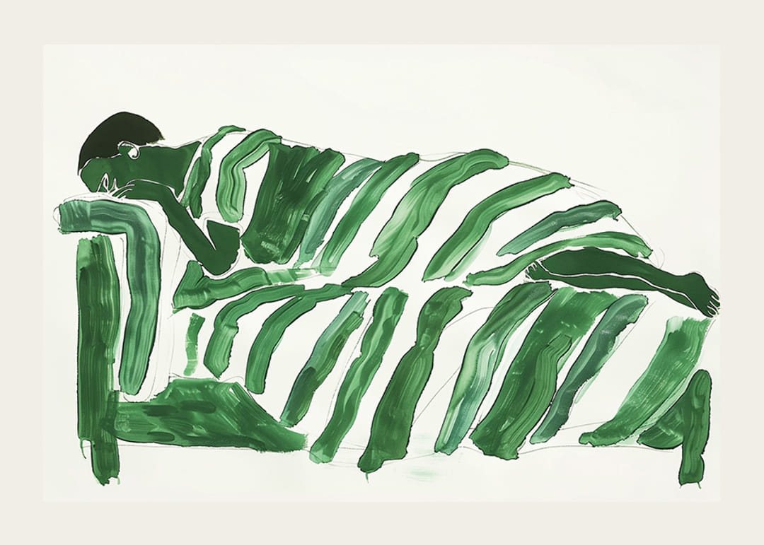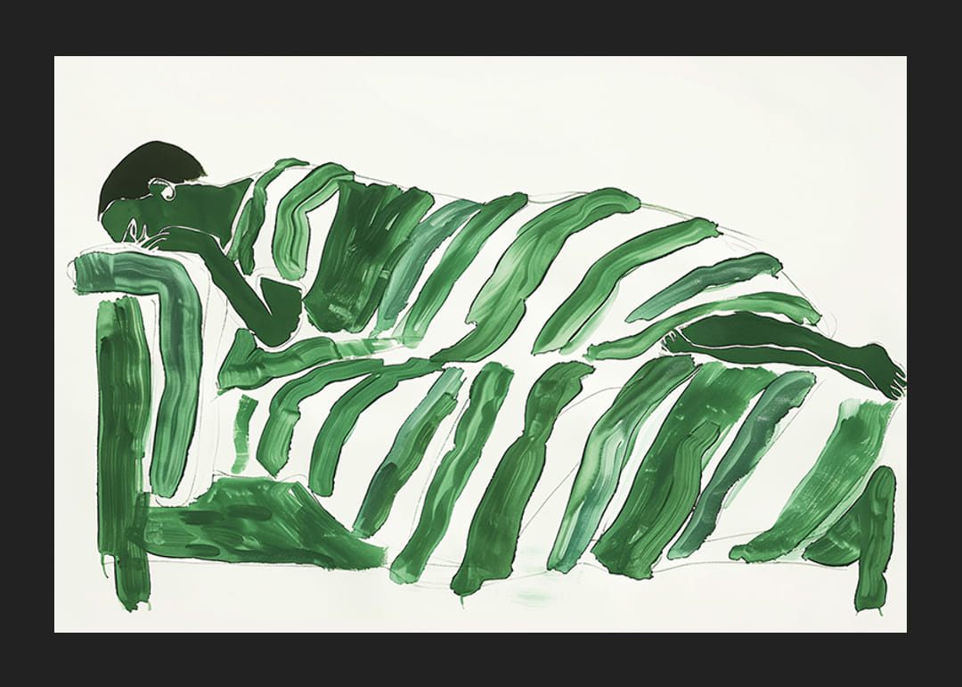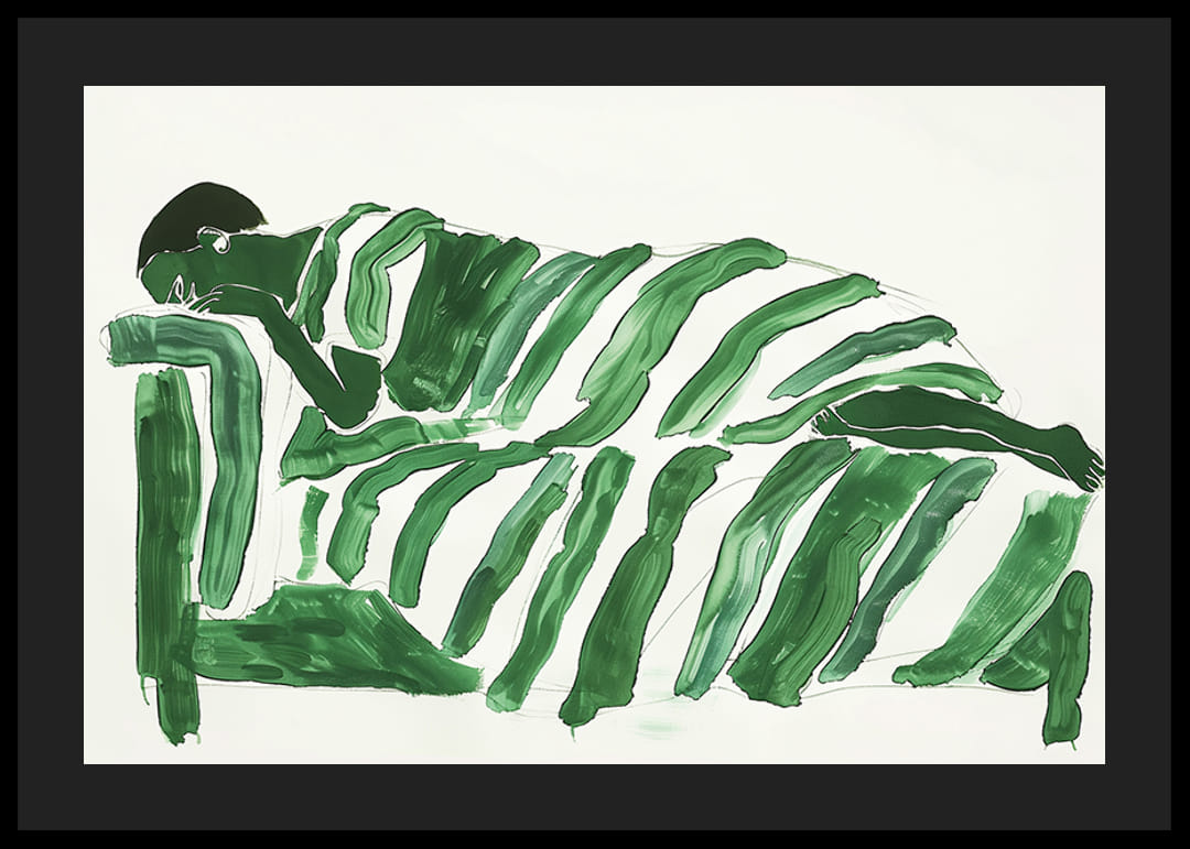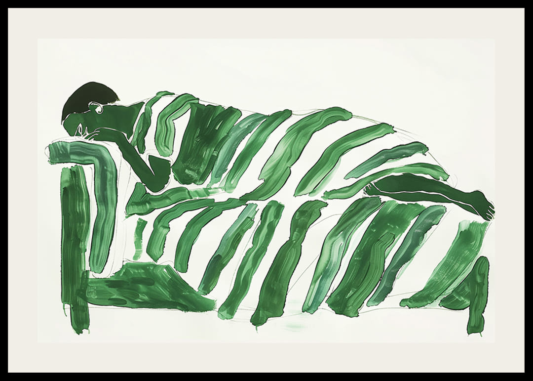 Na tomto fascinujúcom plagáte zelené farby zahaľujú postavu do pokojnej a zasnenej krajiny. Mäkké, plynulé línie vytvárajú pocit odpočinku a hlbokého odrazu. Každý ťah štetcom vyjadruje harmonickú rovnováhu medzi silou prírody a ľudským tichom.
