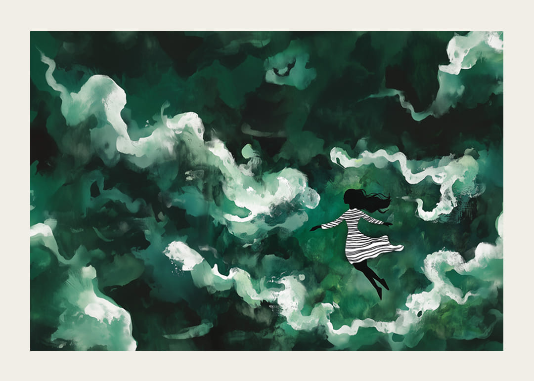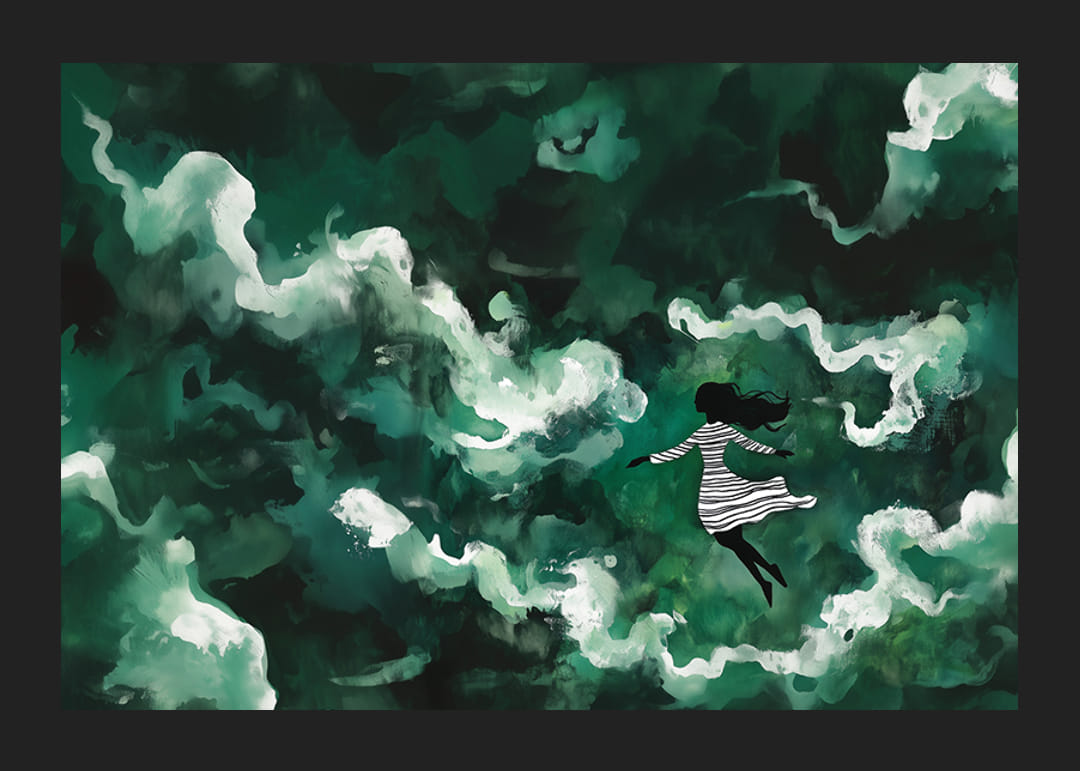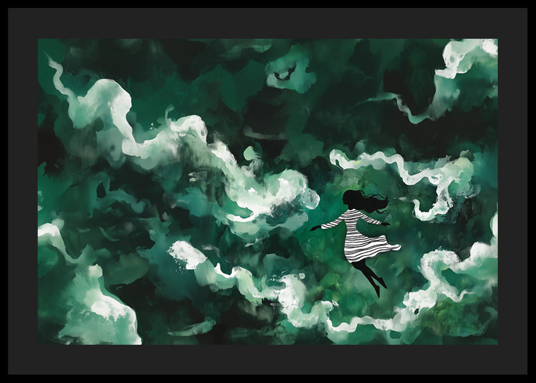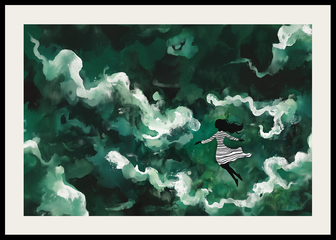 Tento plagát zachytáva magický svet, v ktorom sa dievča vznáša v mori zelených, éterických oblakov. Kontrast medzi jej tmavou siluetou a víriacimi sa bielymi mrakmi vytvára snový pocit slobody a pokoja.