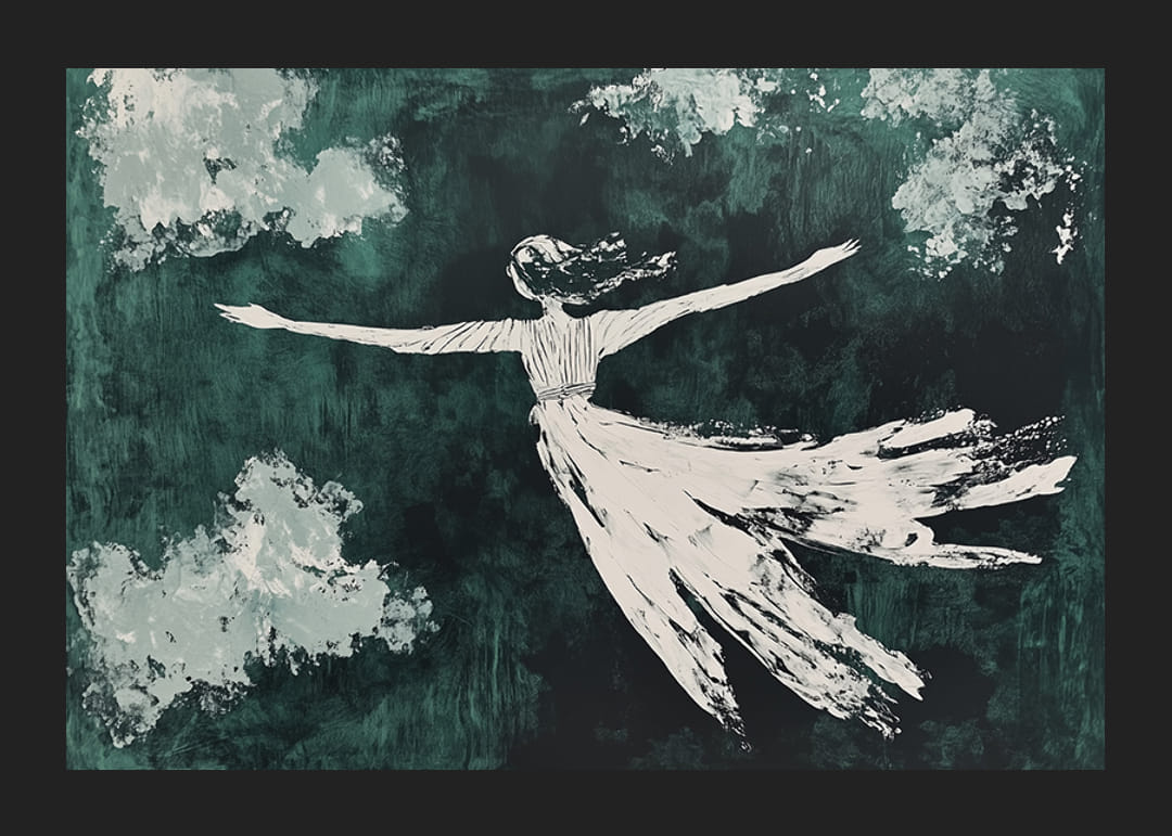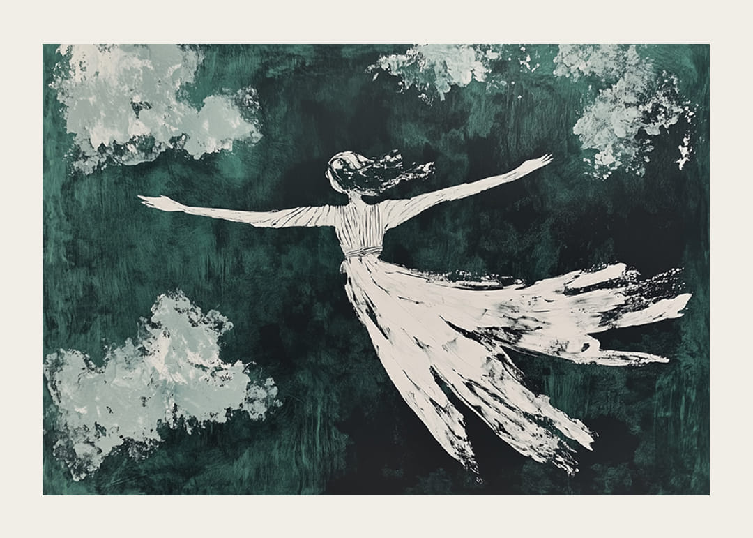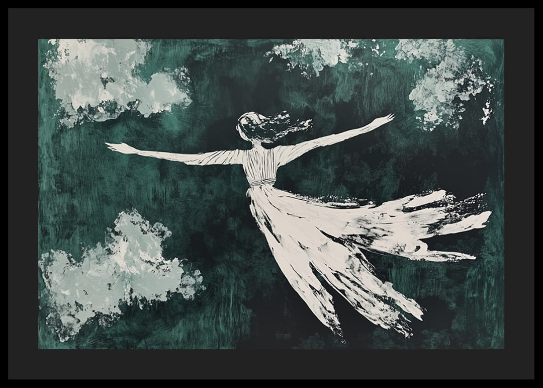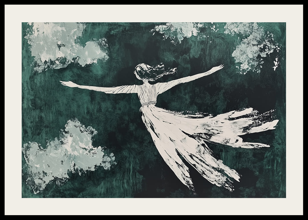 Tento plagát zachytáva snový pohyb postavy, ktorá akoby plávala tajomnou oblohou. Jemný kontrast medzi splývavým tvarom a tmavozelenými odtieňmi vytvára pocit voľnosti a ľahkosti.