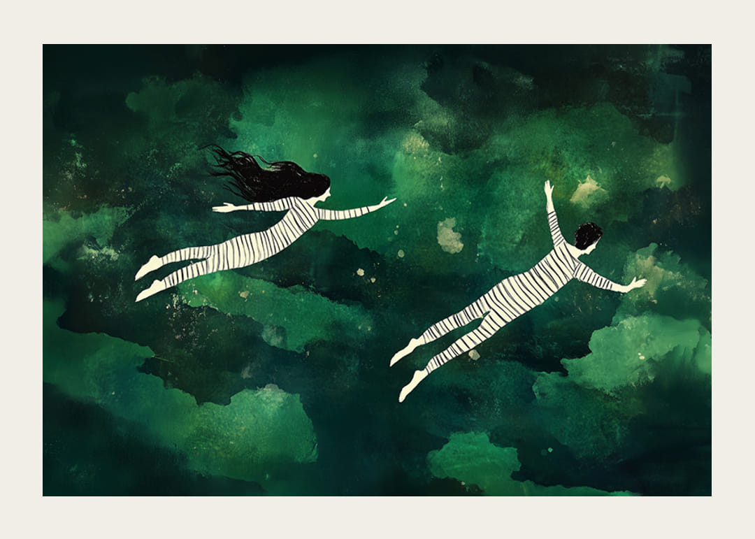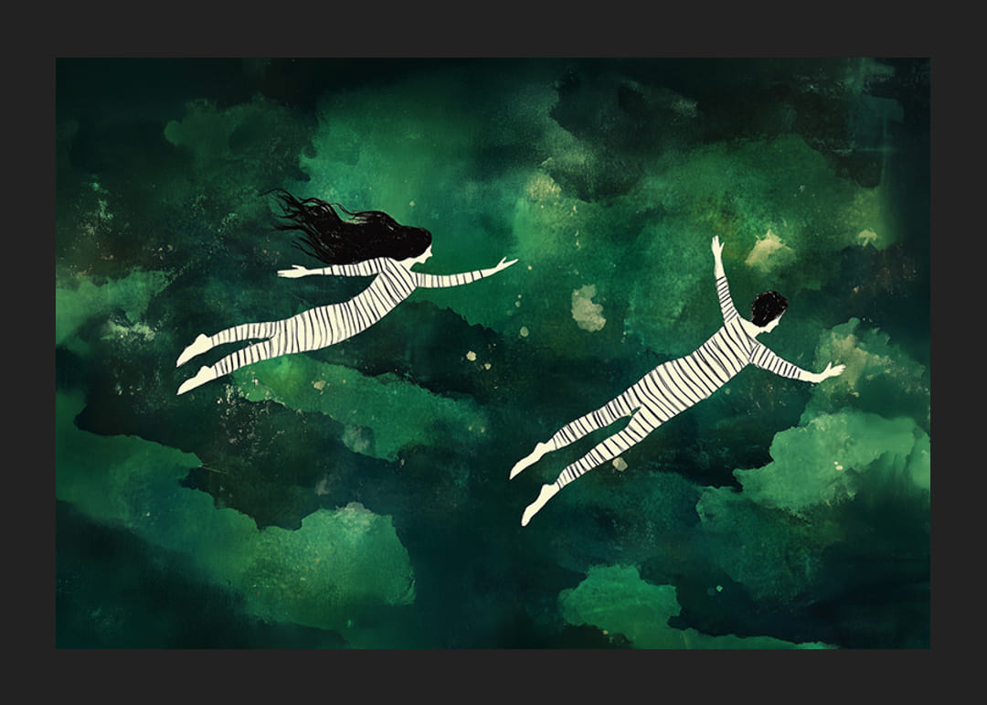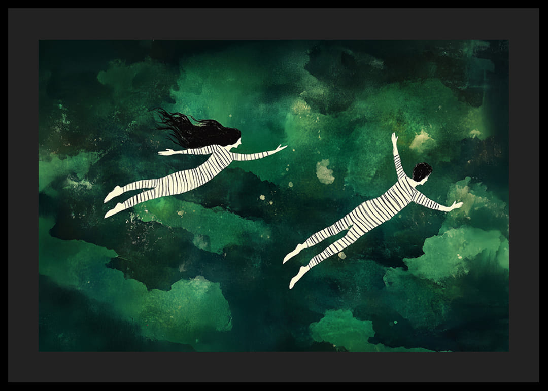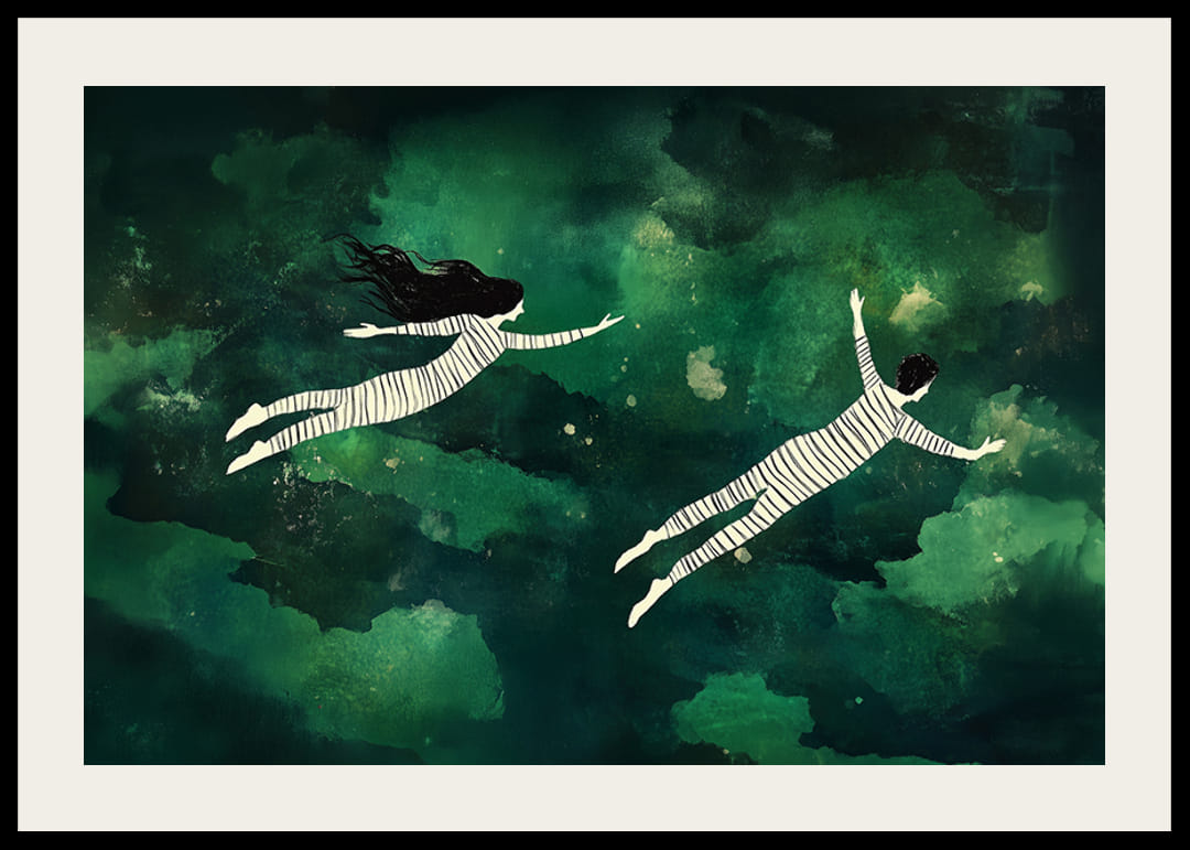 Tento plagát zachytáva čaro snového úniku nočnou oblohou. Čiernobiele postavy sa vznášajú nad morom zelených odtieňov a vytvárajú pocit pohybu a ticha. Tajomná krajina priťahuje fantáziu a dobrodružstvo.