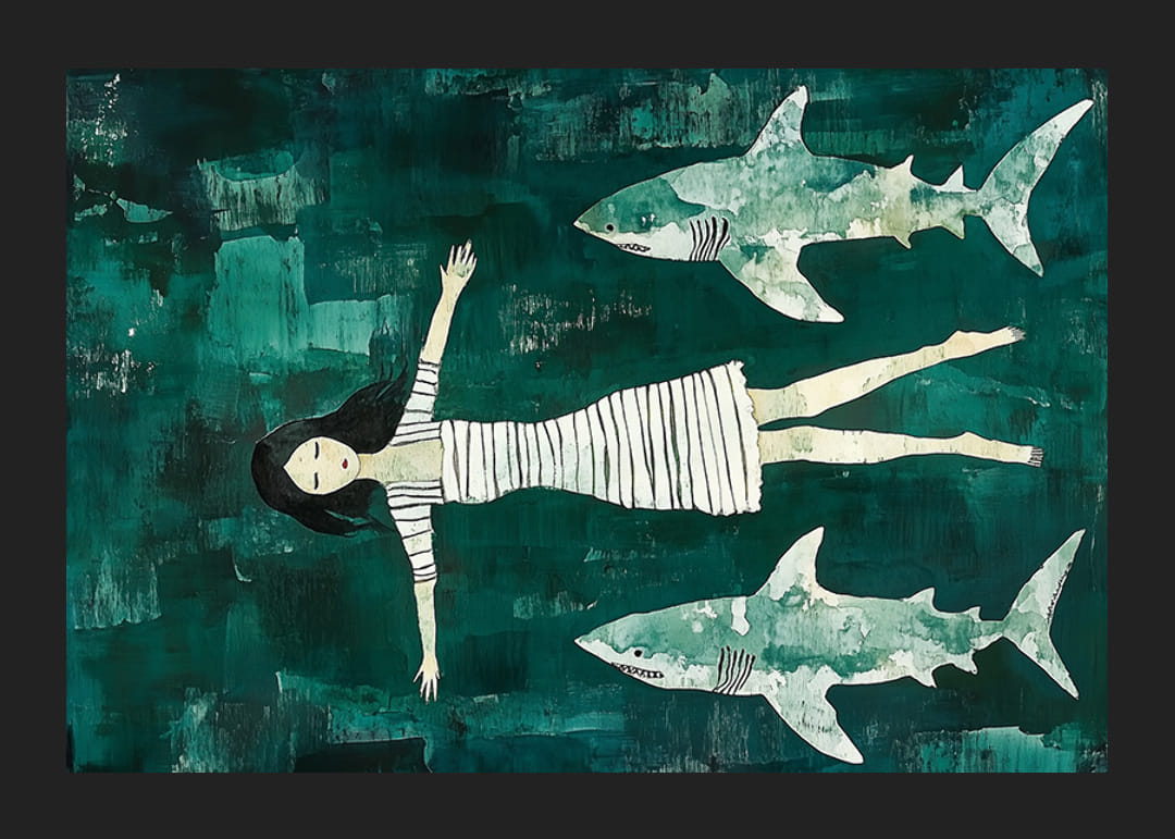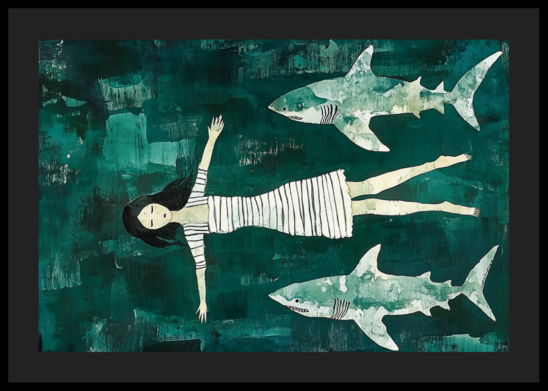 Na tomto podmanivom plagáte sa dievča v pruhovaných šatách kĺže po tmavom oceáne, uvoľnené napriek tomu, že je obklopené žralokmi. Hlboké zelené tóny mora dávajú pocit pokoja a hlbokého tajomstva. Tento harmonický obraz zachytáva pocit nebojácnosti a pokoja.
