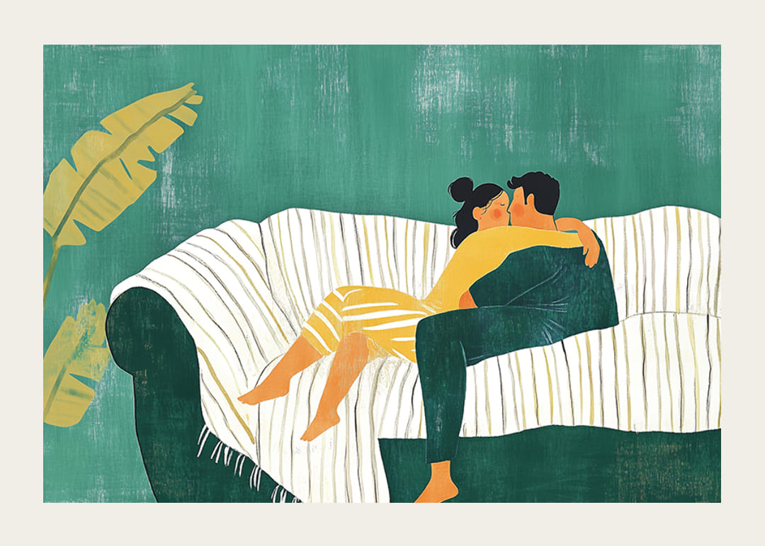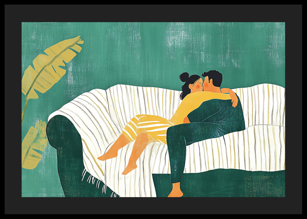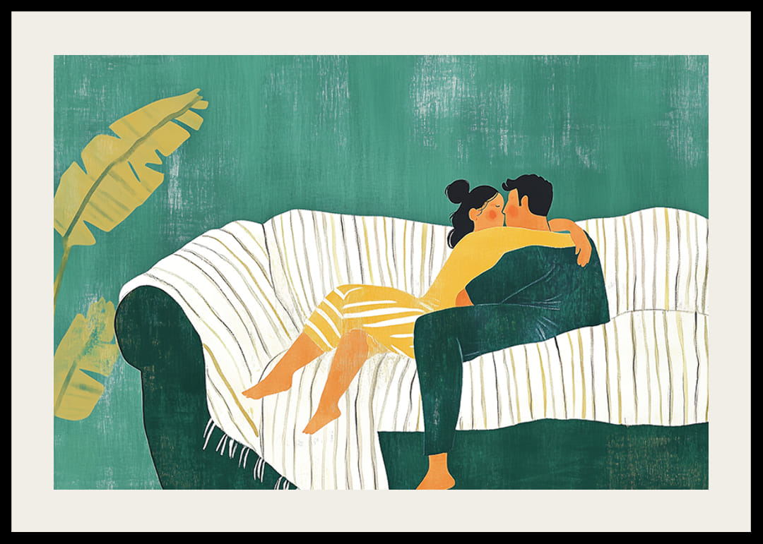 Tento plagát zachytáva intímny moment dvoch ľudí, ktorí sa láskyplne objímajú na pohovke. Jemné zelené pozadie dáva pocit pokoja a intimity, zatiaľ čo blízkosť páru vyžaruje nadčasovú lásku.