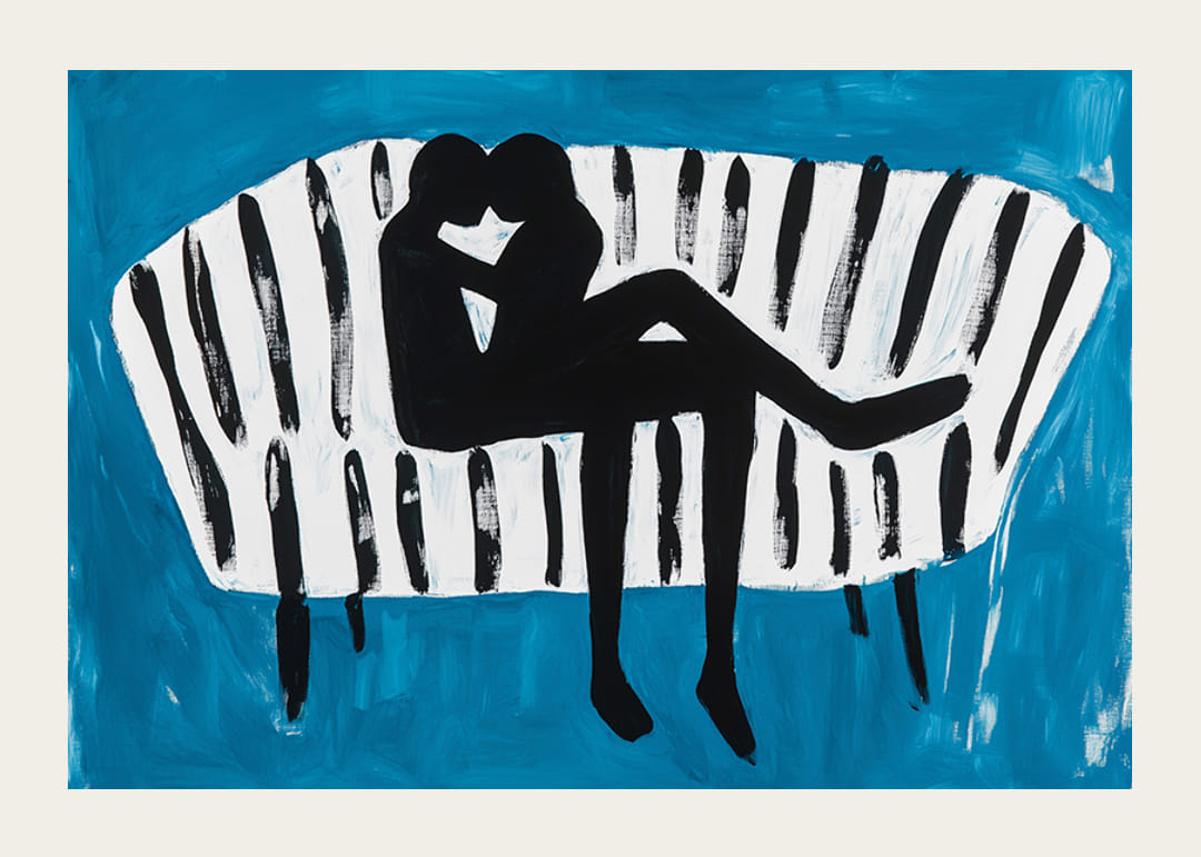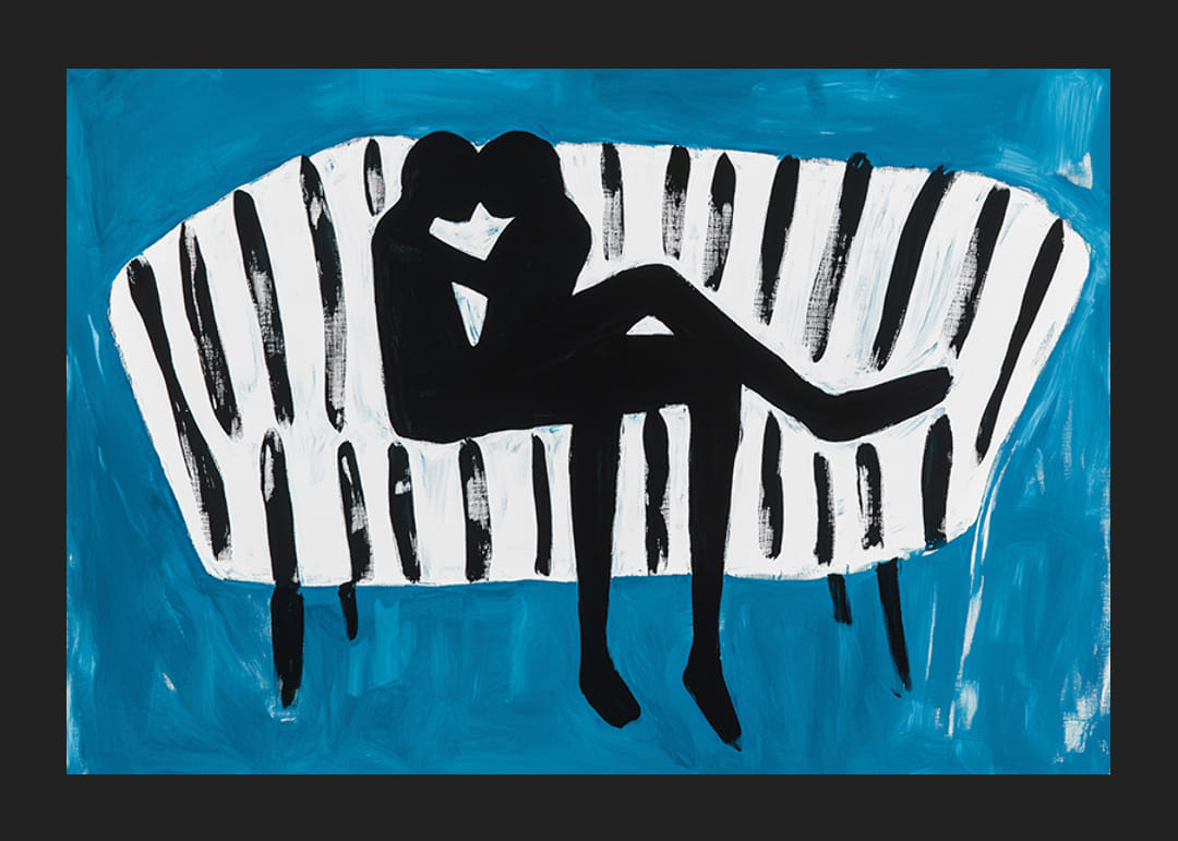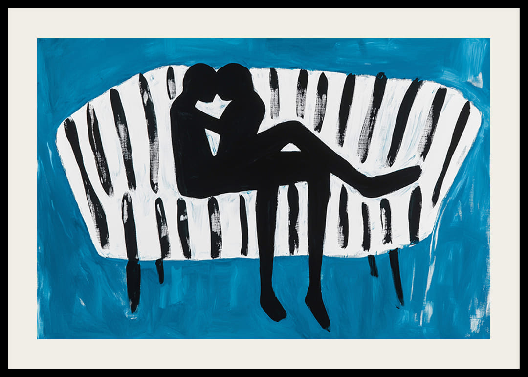 Na tomto podmanivom plagáte je láska zachytená v dynamickej siluete oproti pruhovanej pohovke, vytvorenej v odvážnych, kontrastných farbách. Modré pozadie umocňuje pocit hĺbky a intimity.