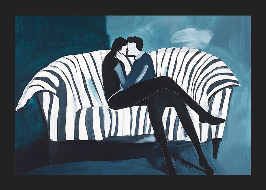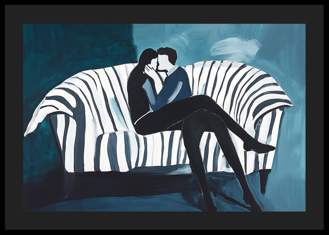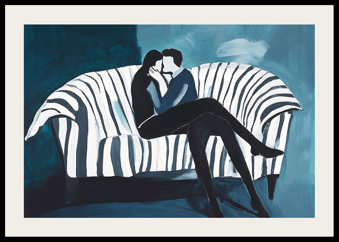 Tento plagát zachytáva nadčasový moment intimity a blízkosti, kde dvaja ľudia sedia zabalení v jemnom objatí na pruhovanej pohovke. Výrazné ťahy štetcom a upokojujúce modré tóny vytvárajú harmonickú atmosféru, ktorá vyžaruje modernosť a jednoduchosť.