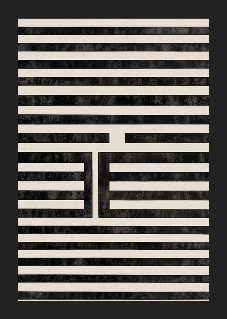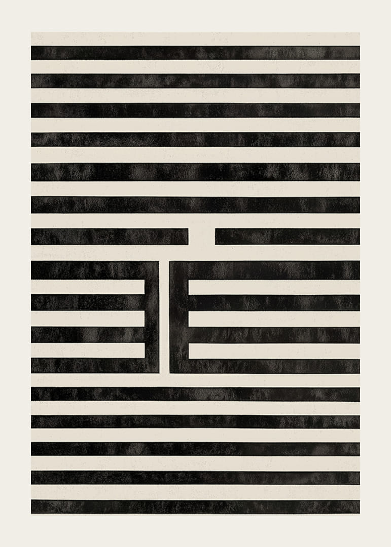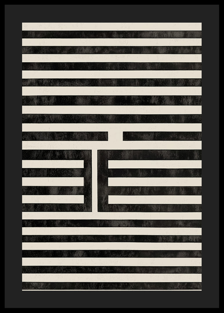 Tento plagát upúta pozornosť svojimi hypnotickými čiernobielymi líniami, ktoré vytvárajú dokonalú symetriu. Prísne poradie línií a jemné tieňovanie vytvárajú pocit hĺbky a pohybu, takmer ako optická ilúzia.