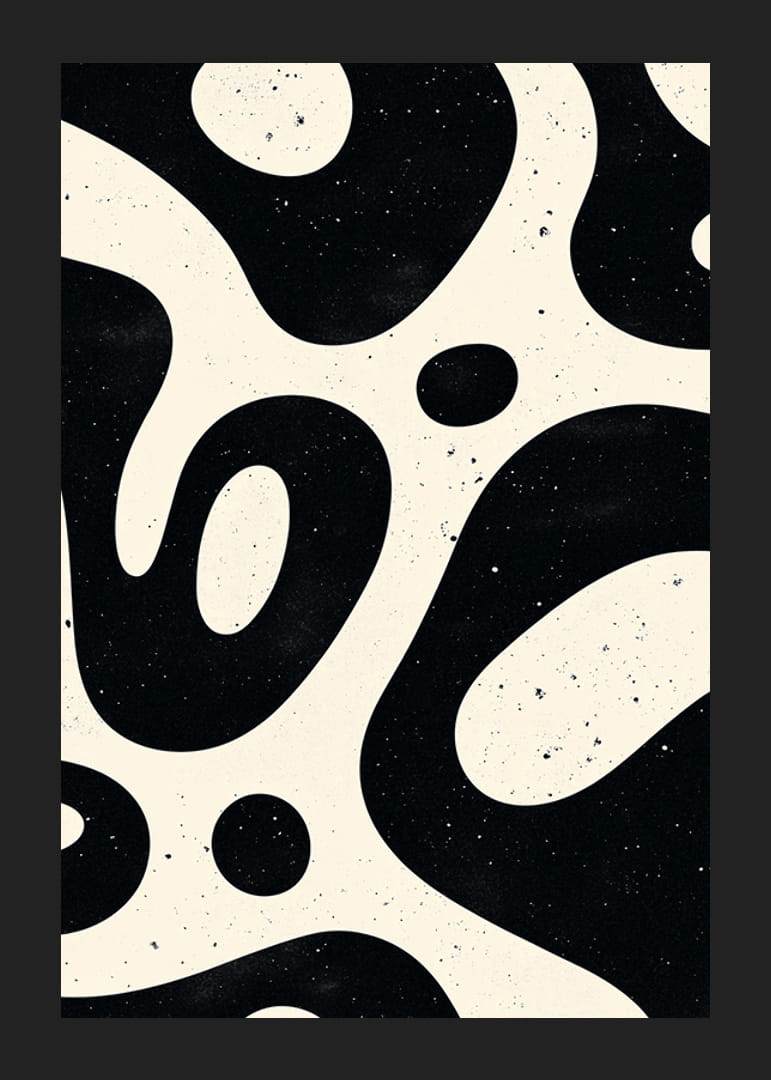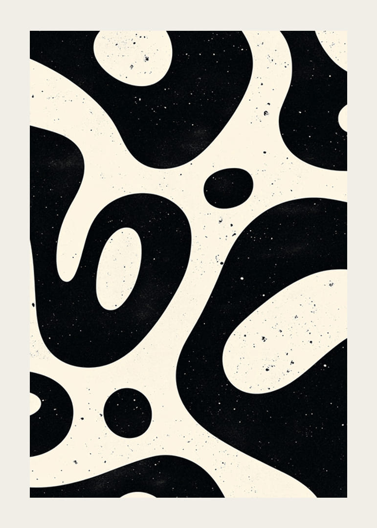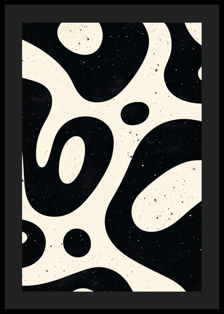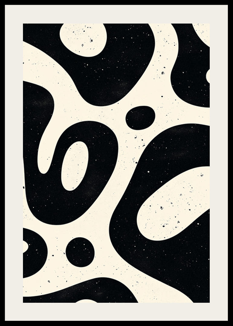 Tento plagát upúta pozornosť svojimi zvlnenými organickými tvarmi v čiernej a bielej farbe, vďaka čomu pôsobí hypnoticky a nadčasovo. Hravý vzor kontrastov a textúr vytvára dynamiku, ktorá očarí miestnosť.