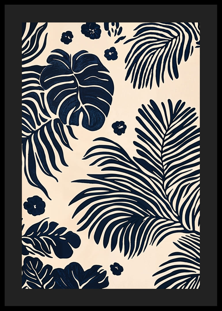 Tento plagát zachytáva podstatu tropickej elegancie s výraznými listovými motívmi v sýto modrých odtieňoch na svetlom pozadí. Zdá sa, že každý list šepká tajomstvá zo vzdialených rajov a dáva pocit pokoja a krásy.