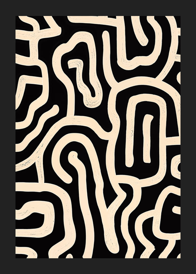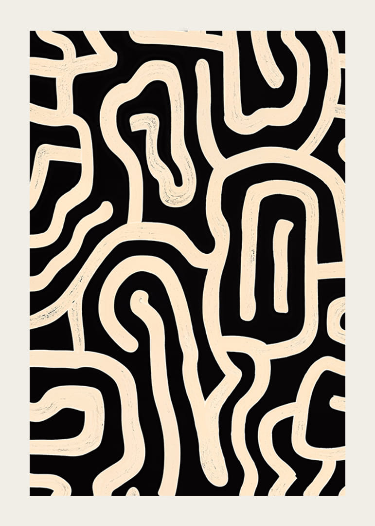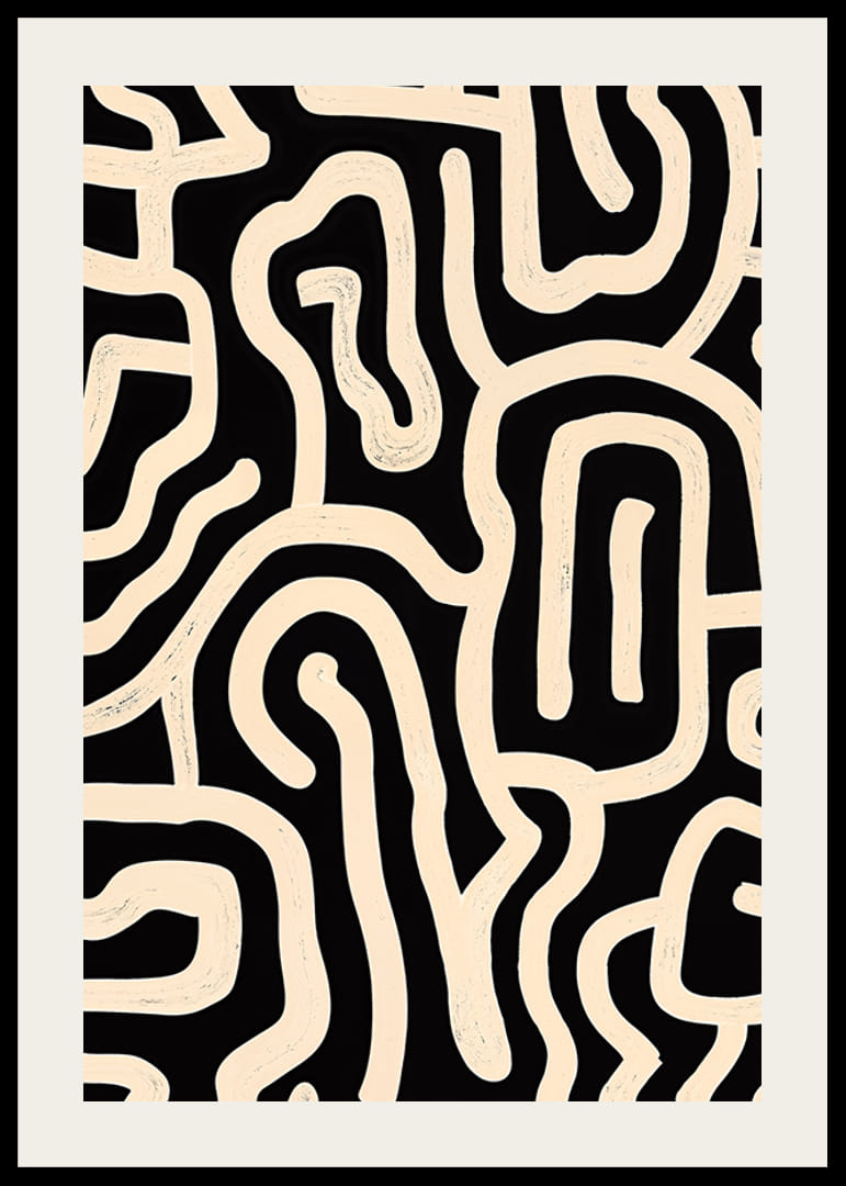 Tento čiernobiely plagát upúta pozornosť svojimi kľukatými líniami, ktoré vytvárajú žiarivý abstraktný vzor. Nadčasový a jednoduchý výber čiernej a bielej farby dodáva motívu sofistikovaný, moderný nádych.