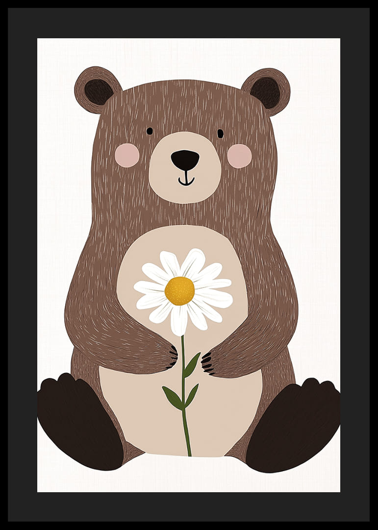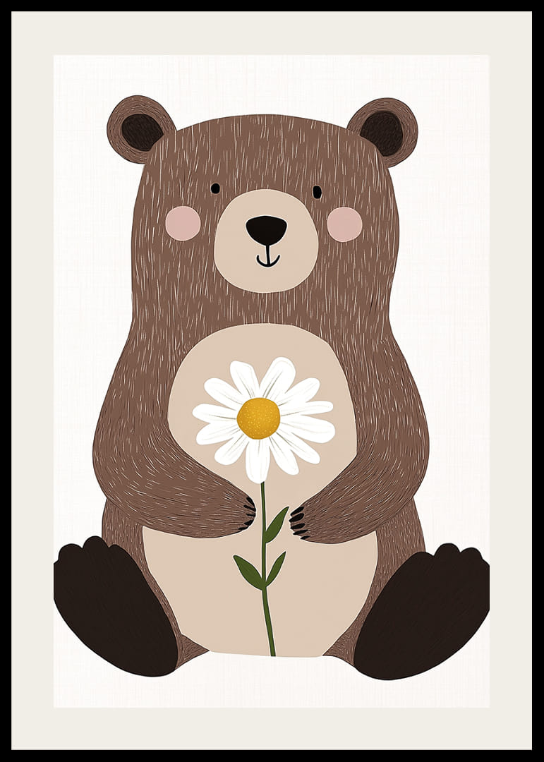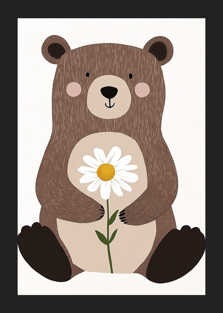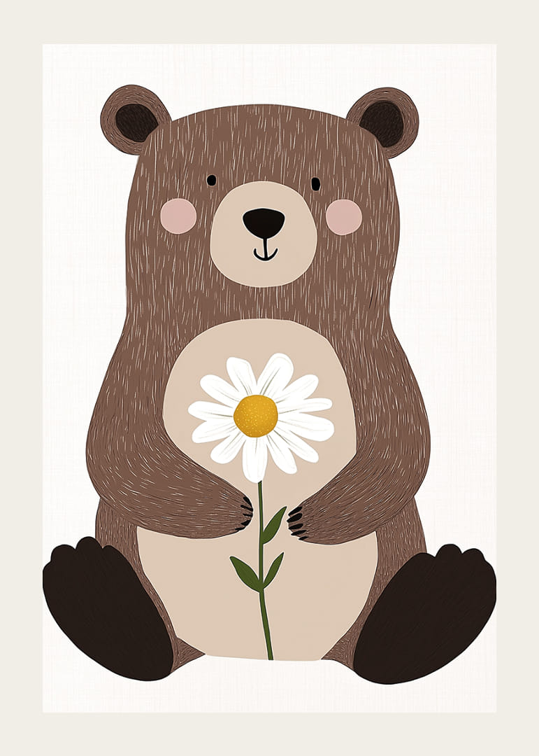 Tento krásny plagát zobrazuje očarujúceho medvedíka, ktorý jemne drží sedmokrásku. Detailný dizajn vytvára hrejivý a príjemný pocit, kde jemné črty medvedíka a kvet ladia v dokonalej rovnováhe. Prirodzené tóny plagátu vytvárajú pokojnú atmosféru a budú hrejivým detailom v každom domove, ideálnym na vytvorenie pokojného a priateľského prostredia.