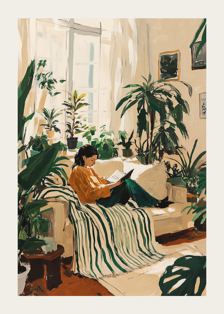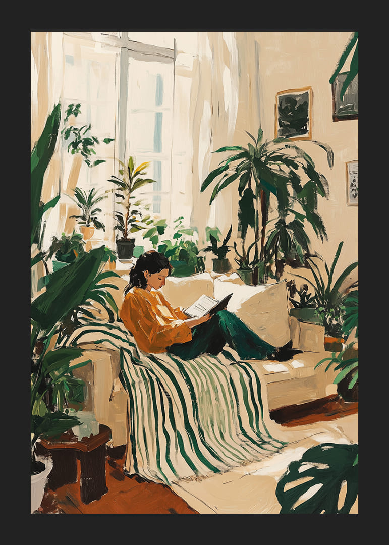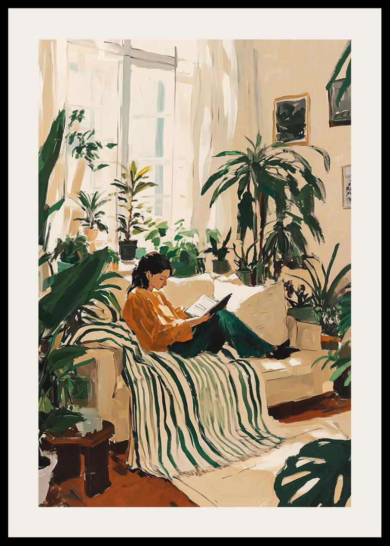 Tento plagát vyvoláva pocit pokoja a relaxácie s osobou sediacou obklopenou bujnými rastlinami v slnečnej miestnosti. Jemné zelené tóny ladia so svetlou výzdobou miestnosti a vytvárajú pokojnú atmosféru. Plagát zachytáva podstatu spojenia s prírodou a zvyšuje náladu každej miestnosti tým, že prináša krásu a pokoj prírody do každodenného života.