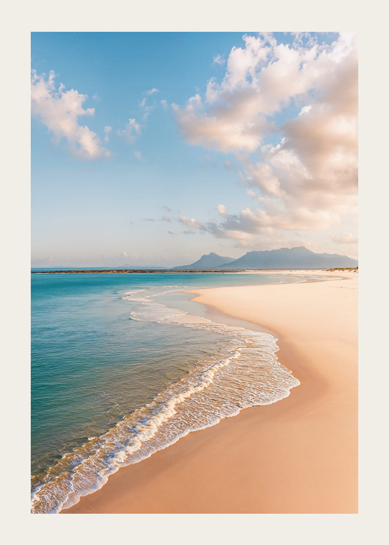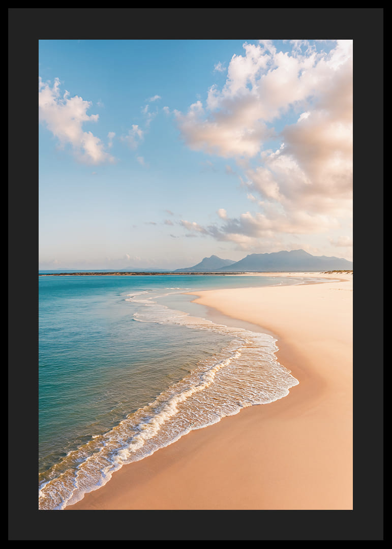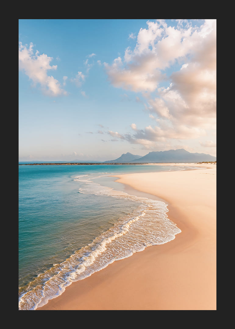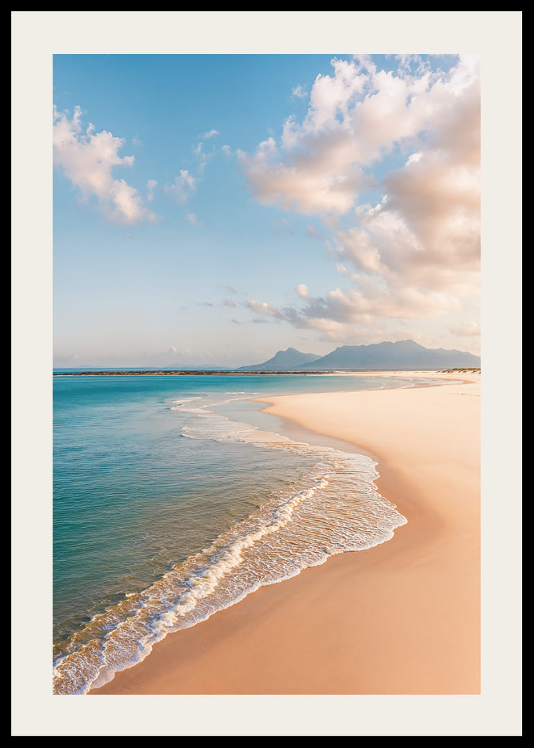 Plagát zachytáva rozprávkovú pláž, kde sa zlatý piesok nekonečne tiahne k jasnému modrému horizontu. Jemné vlny hladkajú pobrežie a vytvárajú pocit večného pokoja. Jemné tiene oblakov tancujú po krajine a dávajú úplný pocit slobody. Tento plagát prináša do vášho domova vzdušnú a pokojnú atmosféru, ideálnu na vytvorenie oázy pokoja a reflexie.