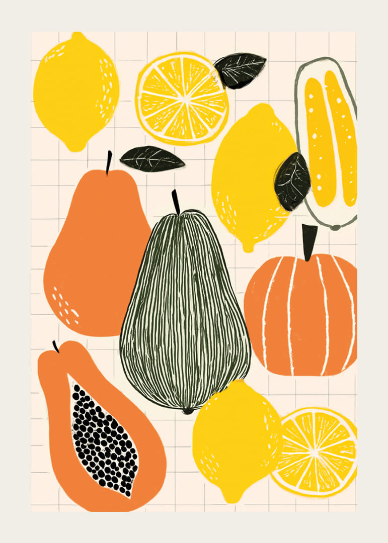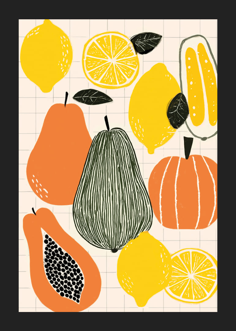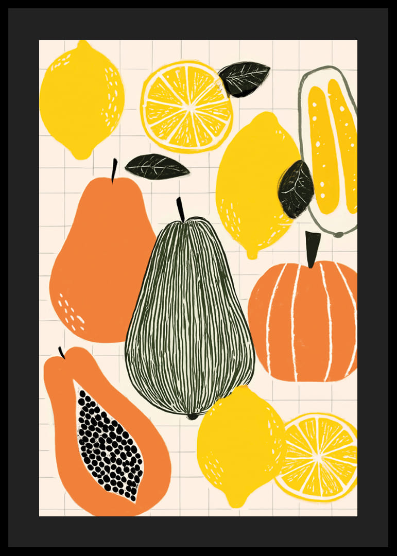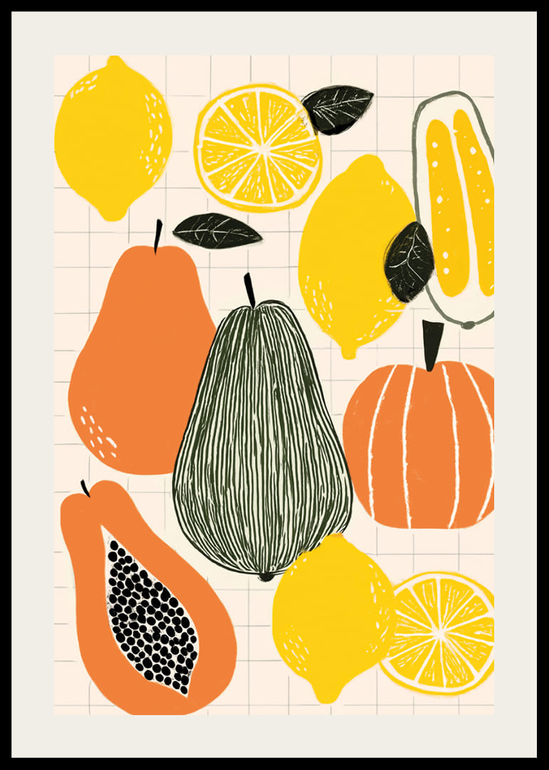Tento plagát zaujme svojimi žiarivými farbami a nápaditými tvarmi ovocia a zeleniny. Sýte oranžové a žlté odtiene harmonicky tancujú na jemnom pozadí a dodávajú vášmu domovu energický a inšpiratívny nádych. Tento plagát, ktorý sa dokonale hodí na rozjasnenie akejkoľvek steny, vytvára teplú a príjemnú atmosféru, ktorá svojím hravým šarmom obohatí každú miestnosť.