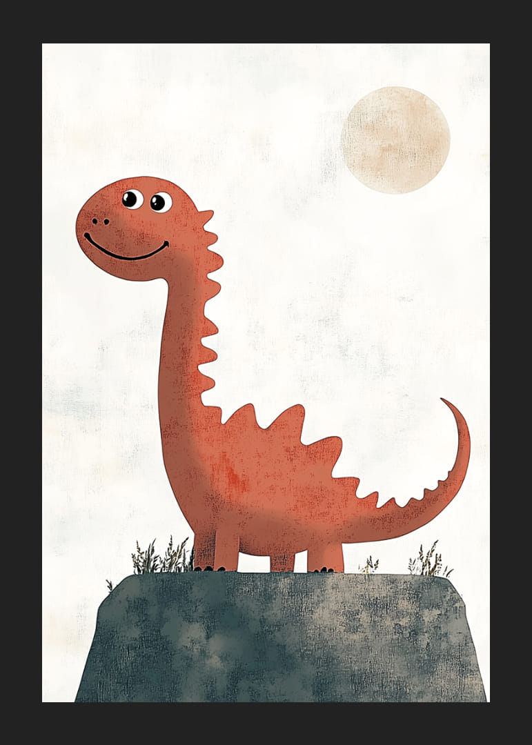 Tento plagát zachytáva očarujúceho dinosaura pod slnečnou oblohou a vytvára pocit radosti a nostalgie. Priateľský dinosaurus s jemnými kontúrami a teplými farbami evokuje úsmevy a dobrodružnú atmosféru. Plagát vnáša život a energiu do každej miestnosti a zároveň prispieva k hravej a prívetivej atmosfére, ktorá pripomína praveké časy.