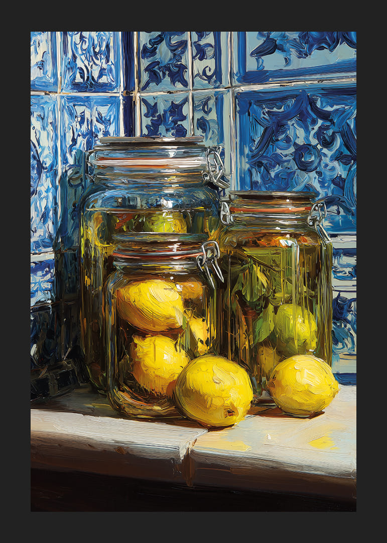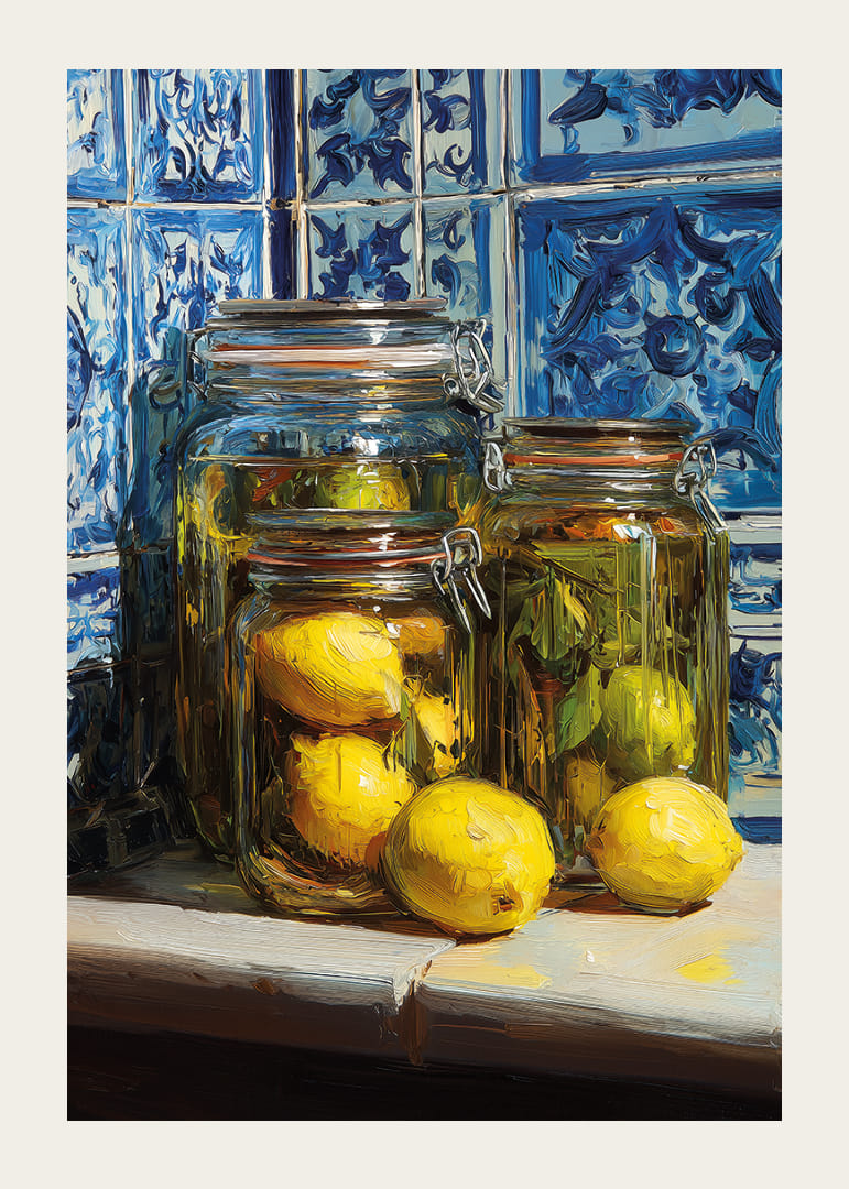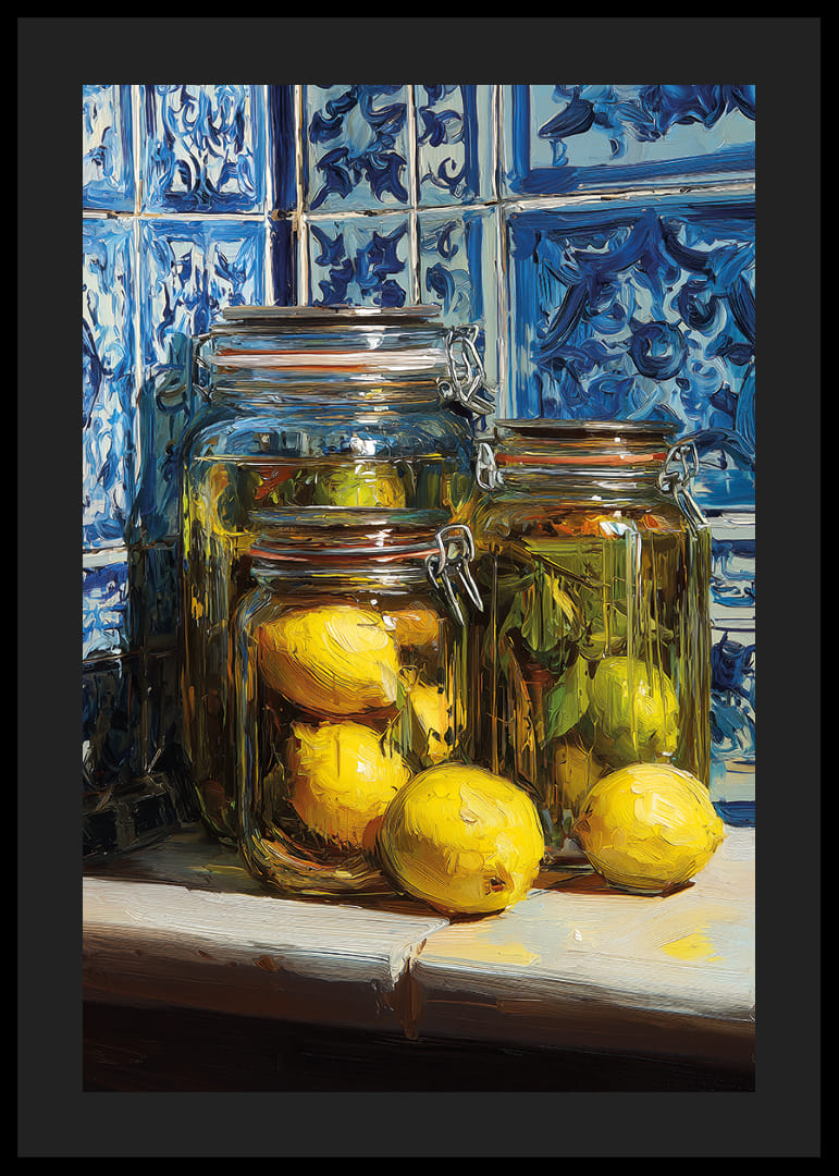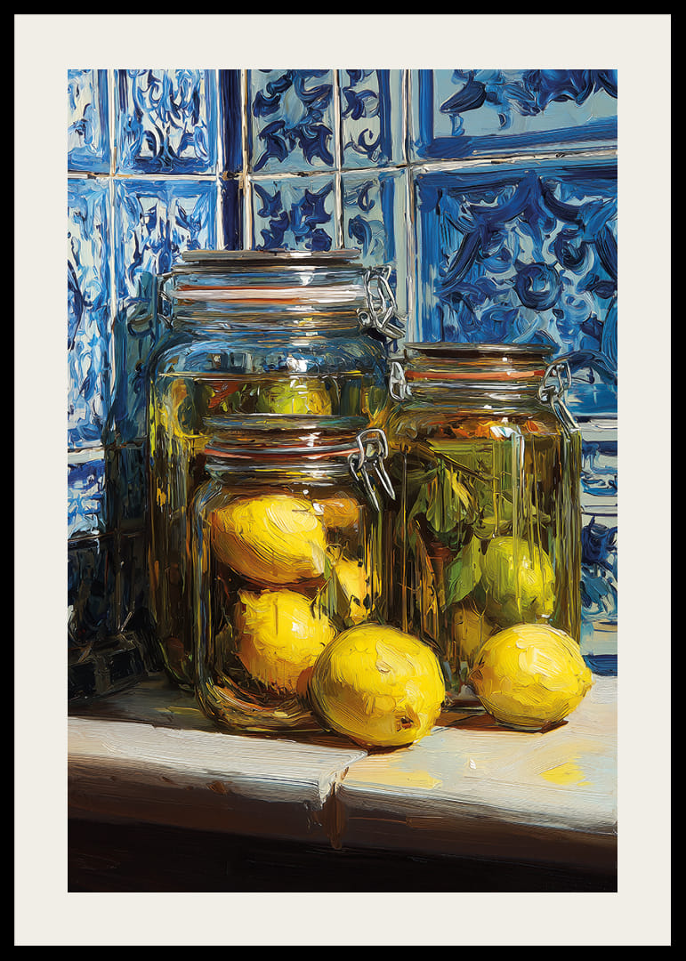 Tento plagát je oslavou jednoduchej krásy so slnečnými citrónmi v čírych sklenených pohároch na klasickej modrej obkladačke na stene. Sýte farby a lesklé povrchy vytvárajú vizuálne príťažlivý kontrast, ktorý okamžite upúta pozornosť. Plagát dodáva miestnosti pocit sviežosti a tepla, ideálny na povzbudenie atmosféry v kuchyni alebo jedálni a šírenie svetla v každodennom živote.