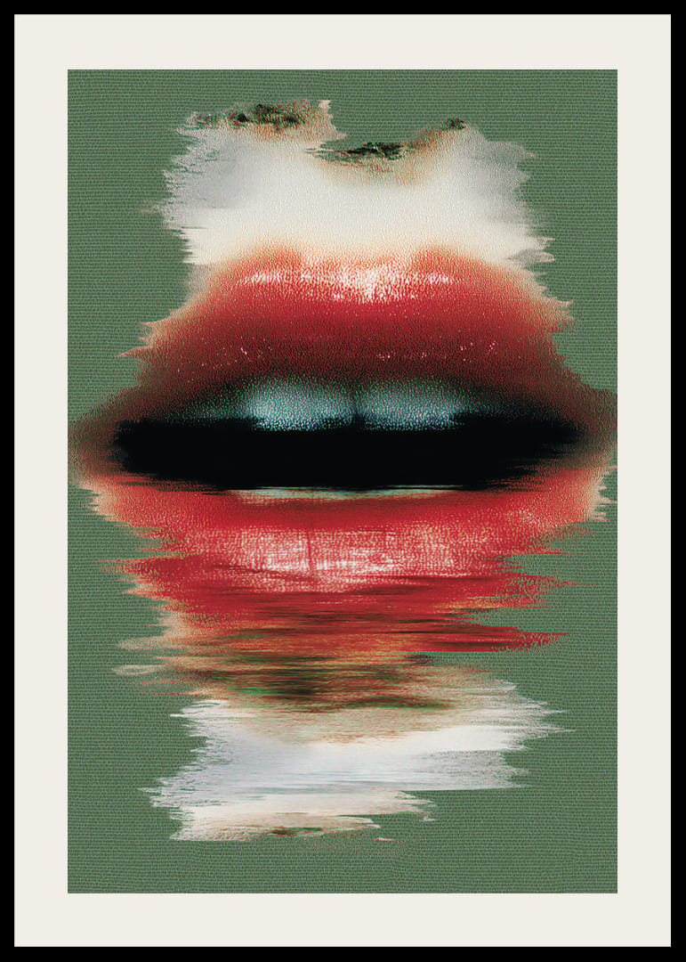 Tento plagát zaujme svojimi intenzívne červenými perami na tmavozelenom pozadí a vytvára okamžitý dramatický efekt. Lesklé pery, neurčito zrkadlovo smerujúce smerom nadol, dodávajú pocit tajomného pôvabu a moderného umenia. Tento plagát, ktorý je perfektný ako ústredný bod v obývačke, okamžite zmení náladu svojou výraznou a farebnou prítomnosťou a premení miestnosť na miesto, kde sa ľudia môžu rozprávať.