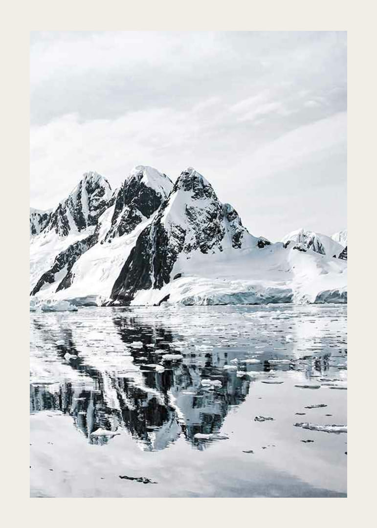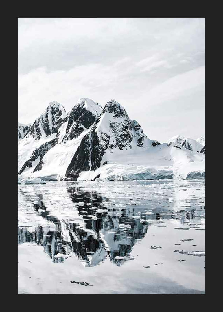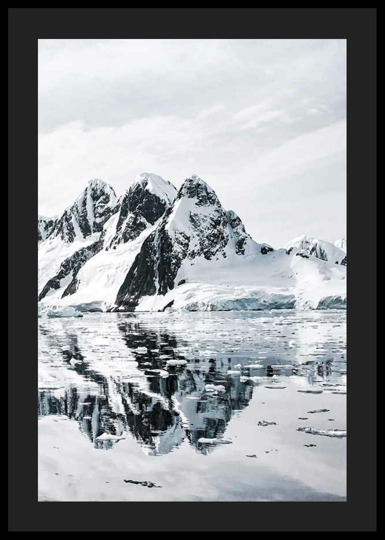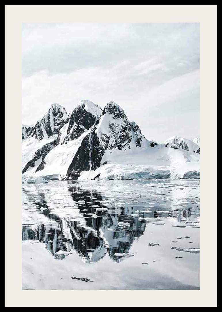 Zasnežené vrcholky hôr sa týčia na pozadí jasnej oblohy a čierne útesy kontrastujú s bielym snehom. Ľadové kryhy plávajú na pokojnom mori, kde sa jasne odrážajú ostré tvary hôr. Táto zimná krajina dodáva plagátu chladný a minimalistický vzhľad, ktorý sa perfektne hodí do moderných obývacích izieb alebo kancelárií.