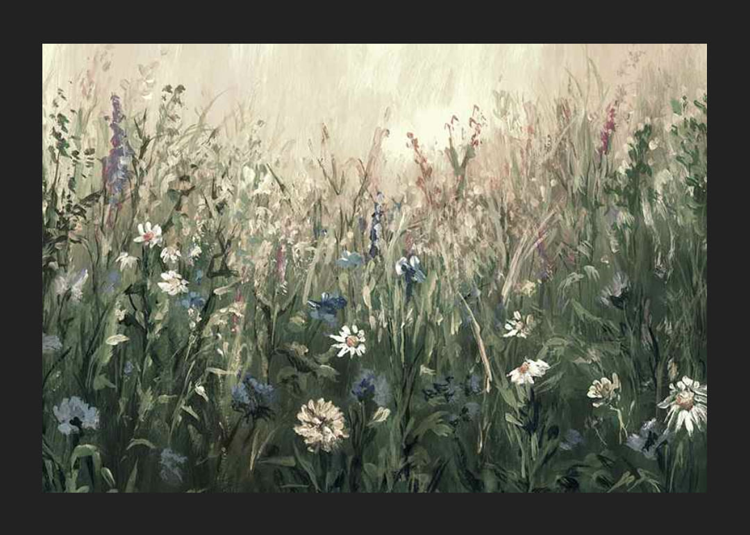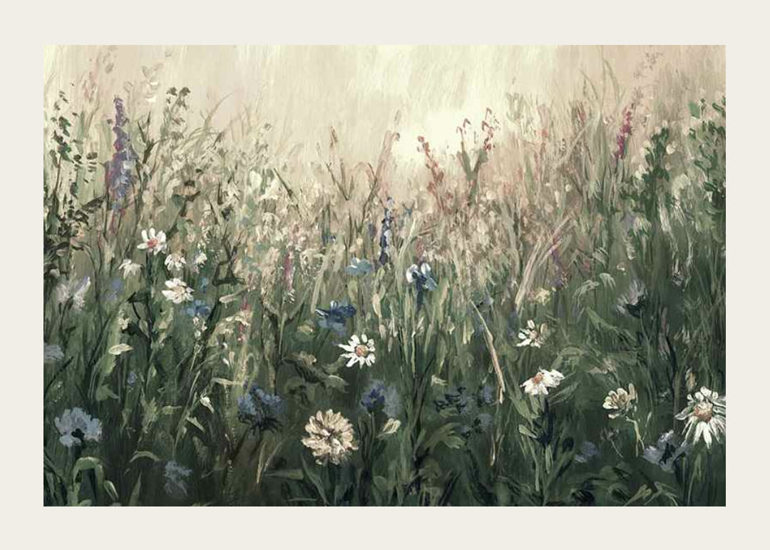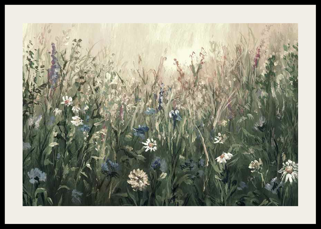Divoké kvety v modrej, bielej a svetlofialovej farbe sa rozprestierajú v hustom trávnatom poli na jemnom svetlom pozadí. Zelené odtiene sú zmiešané s teplými béžovými a studenými modrými tónmi, čím vytvárajú prirodzený pocit leta. Tento plagát dodáva miestnosti jemný botanický charakter a je vhodný do všetkého od chodby až po obývačku.