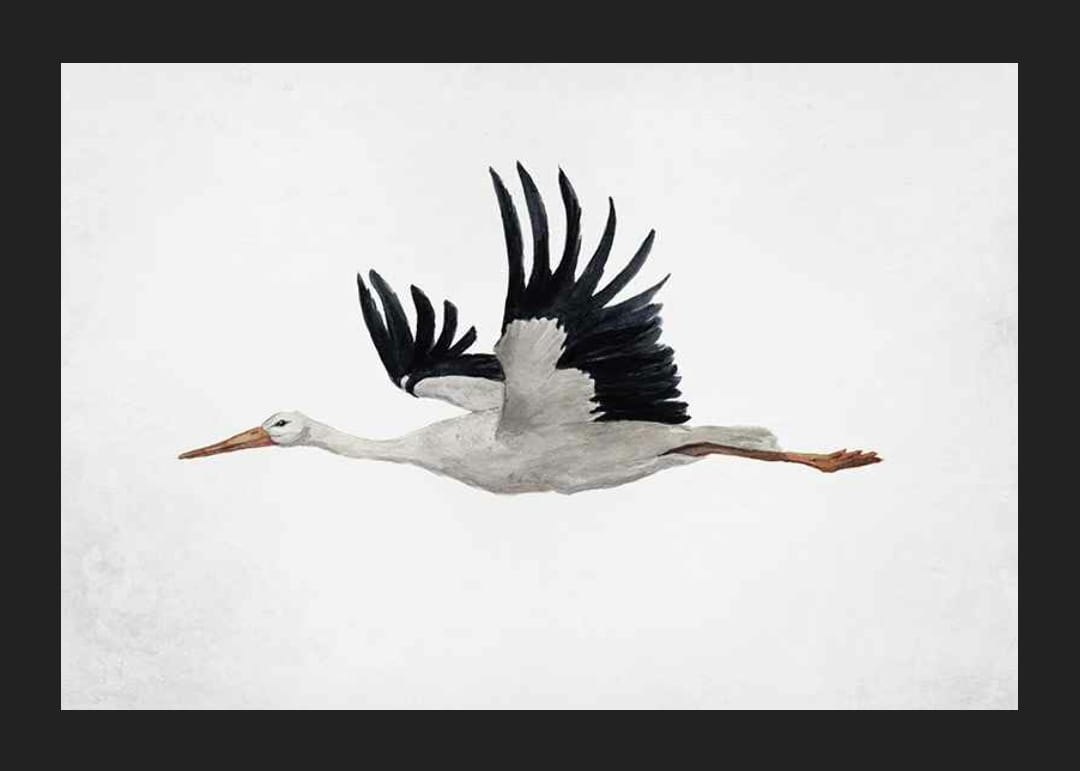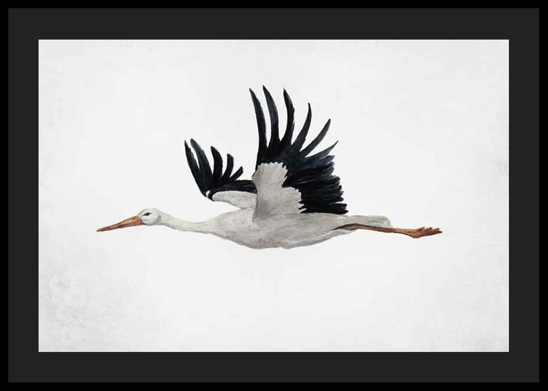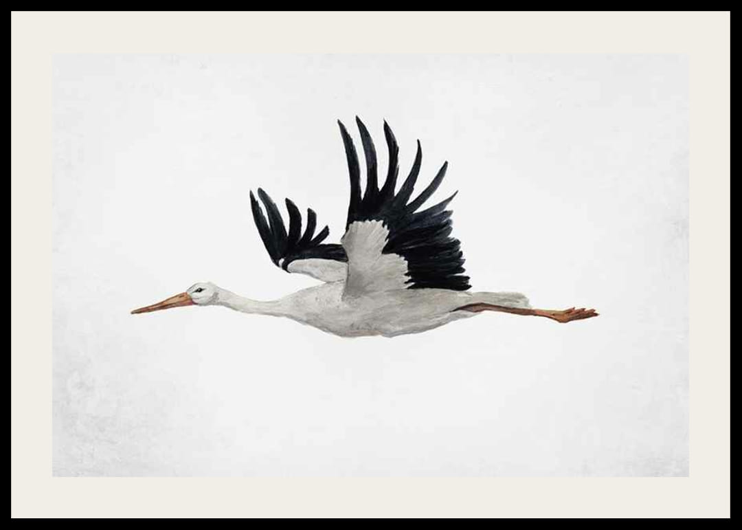 Bocian s rozprestretými krídlami je zobrazený v lete, namaľovaný akvarelom v jemných sivých a čiernych tónoch. Biele pozadie má decentnú textúru, ktorá zvýrazňuje tvar a pohyb vtáka. V detskej izbe, chodbe alebo ako súčasť steny inšpirovanej prírodou bude tento plagát štýlovým doplnkom interiéru.