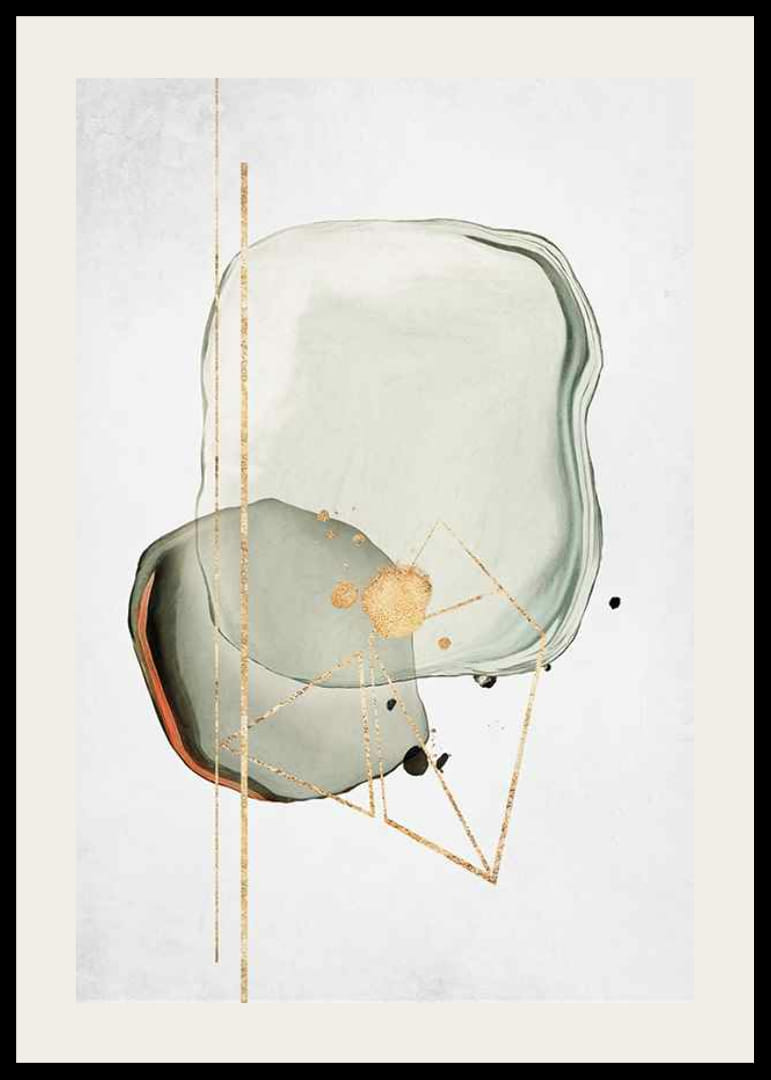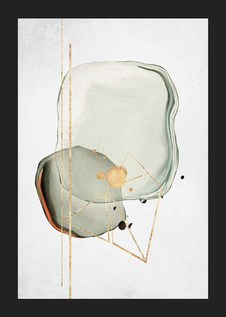 Motív pozostáva z jemne priehľadných tvarov v zelenej a sivej farbe, kombinovaných s čiarami a tvarmi v zlatej farbe na mierne textúrovanom svetlom pozadí. Niekoľko čiernych detailov ho rozdeľuje a dodáva hĺbku. Tento plagát vytvára moderný dojem a je vhodný najmä do obývačky, pracovne alebo chodby.