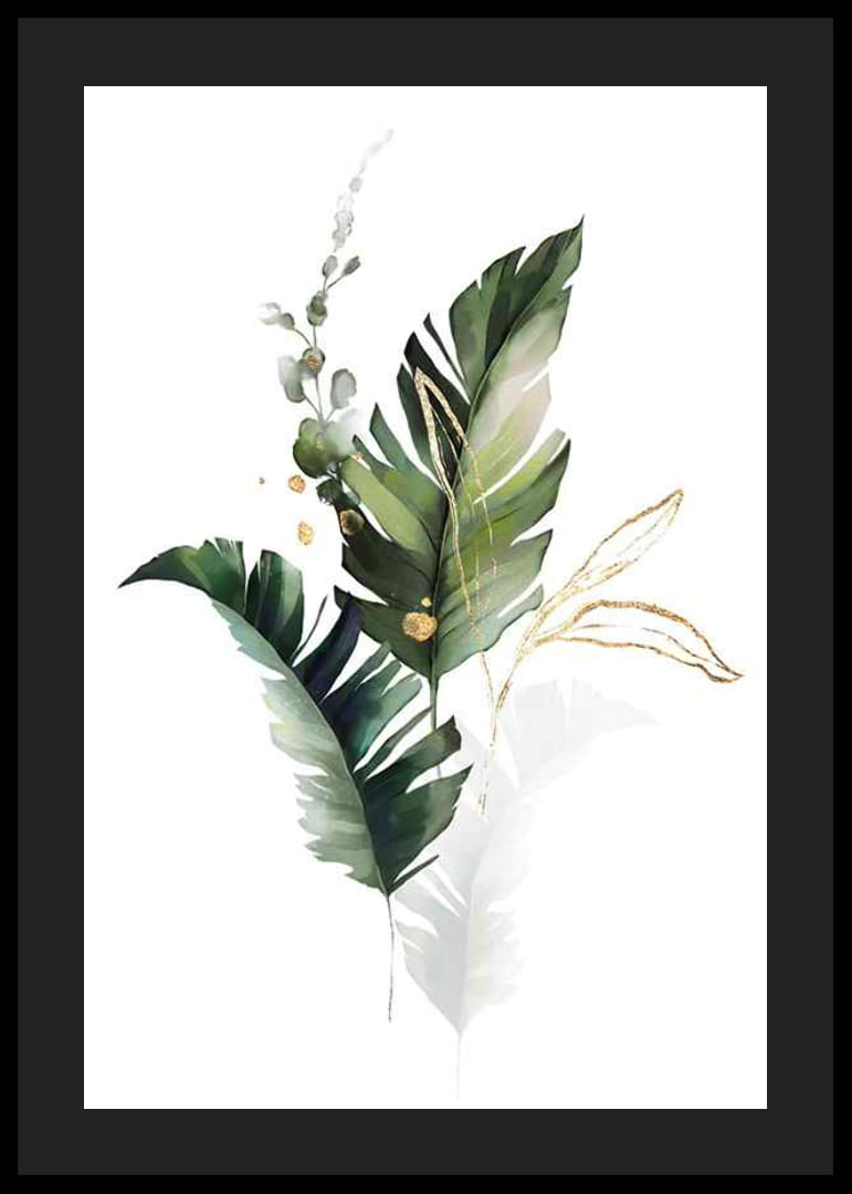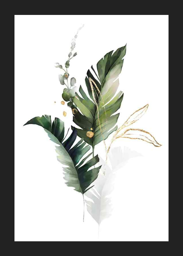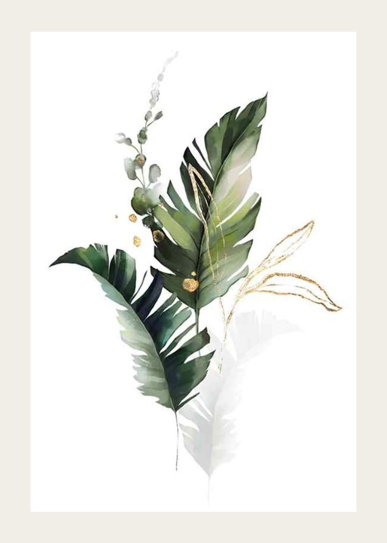 Veľké listy v rôznych odtieňoch zelenej sa objavujú s jemnými prechodmi do bielej, doplnené tenkými zlatými čiarami a malými zlatými akcentmi. Motív pôsobí vzdušne a jemne priehľadne, čo plagátu dodáva moderný vzhľad. Neváhajte a umiestnite tento plagát do obývačky, chodby alebo spálne pre štýlový nádych prírody.