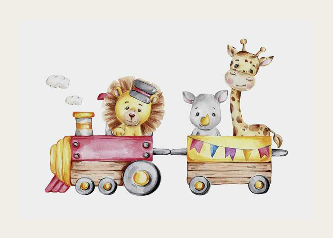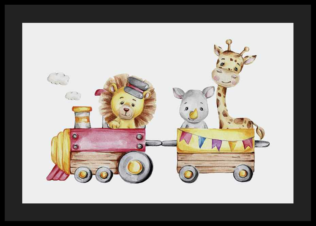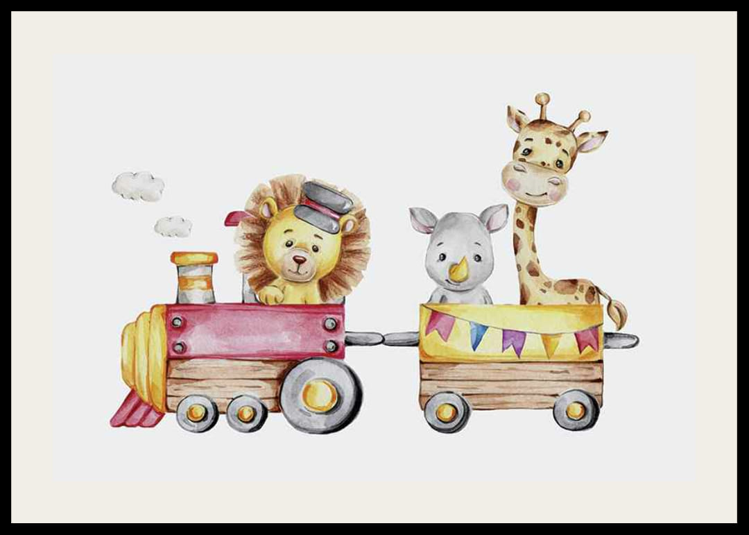 Motív pozostáva z leva s klobúkom, ktorý riadi červeno-žltý vlak, za ktorým nasleduje vagón s malým nosorožcom a žirafou s dlhým krkom. Svetlé pozadie a jemné farby vytvárajú hravý pocit. Tento plagát je ideálny do detských izieb a prispieva k priateľskej a nápaditej atmosfére.
