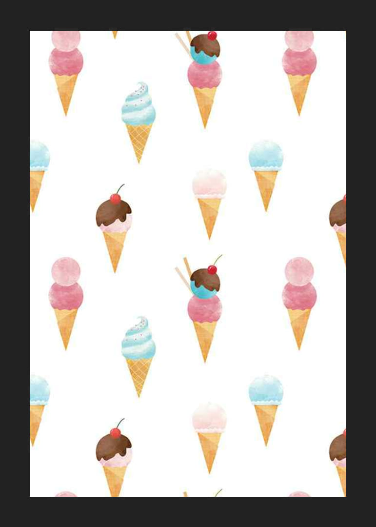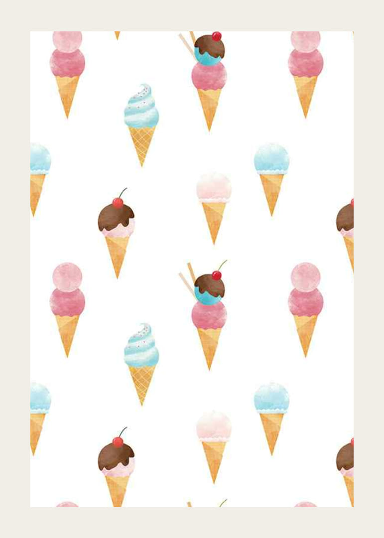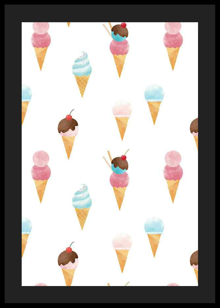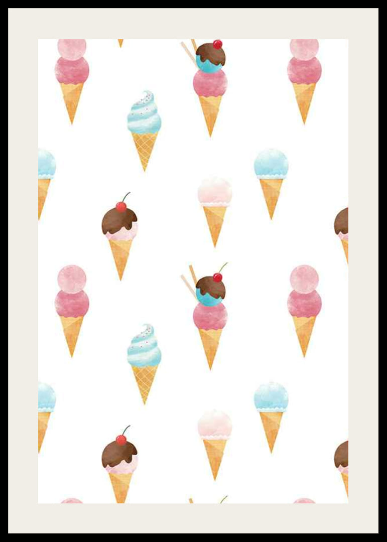 Zmrzliny v rôznych farbách a variantoch, ako je ružová, modrá a čokoládová, sa opakujú v hravom vzore na bielom pozadí. Rôzne tvary kornútkov a guľôčok, niektoré ozdobené čerešňami alebo polevou, dodávajú tomuto plagátu živý a detský nádych. Pekne sa hodí do detskej izby alebo herne a vytvára veselú atmosféru.