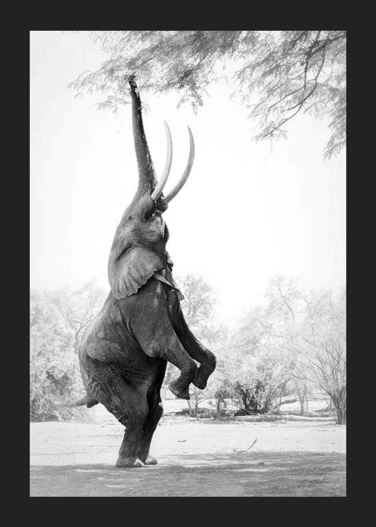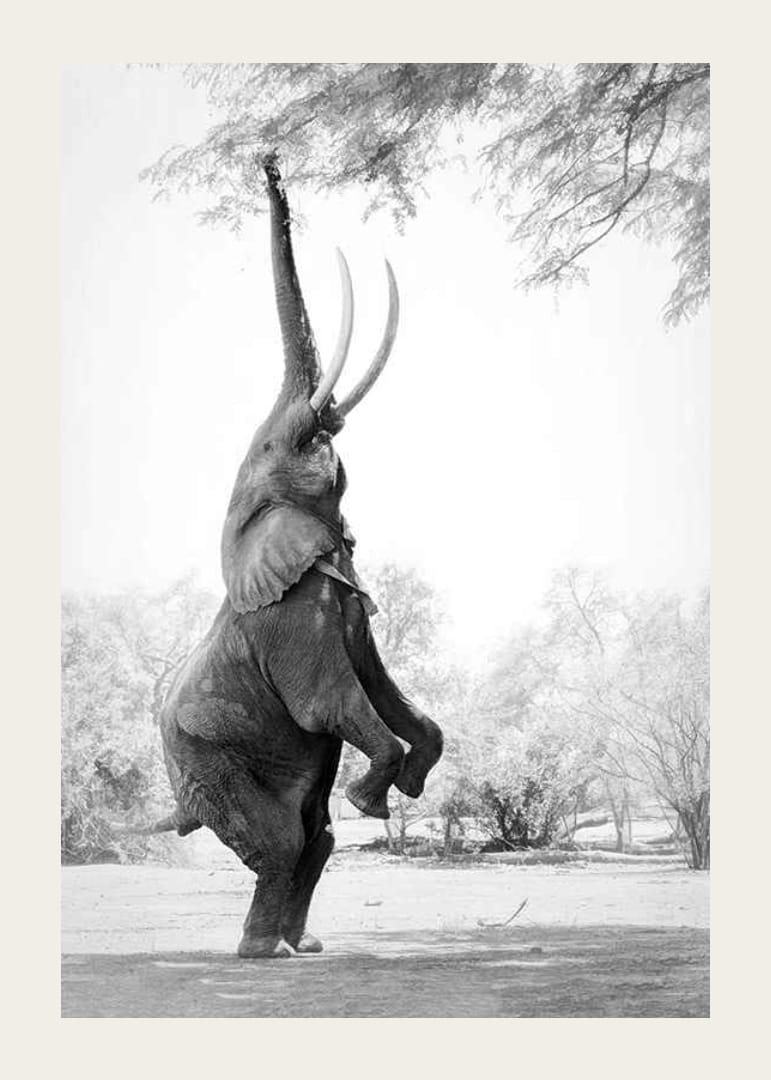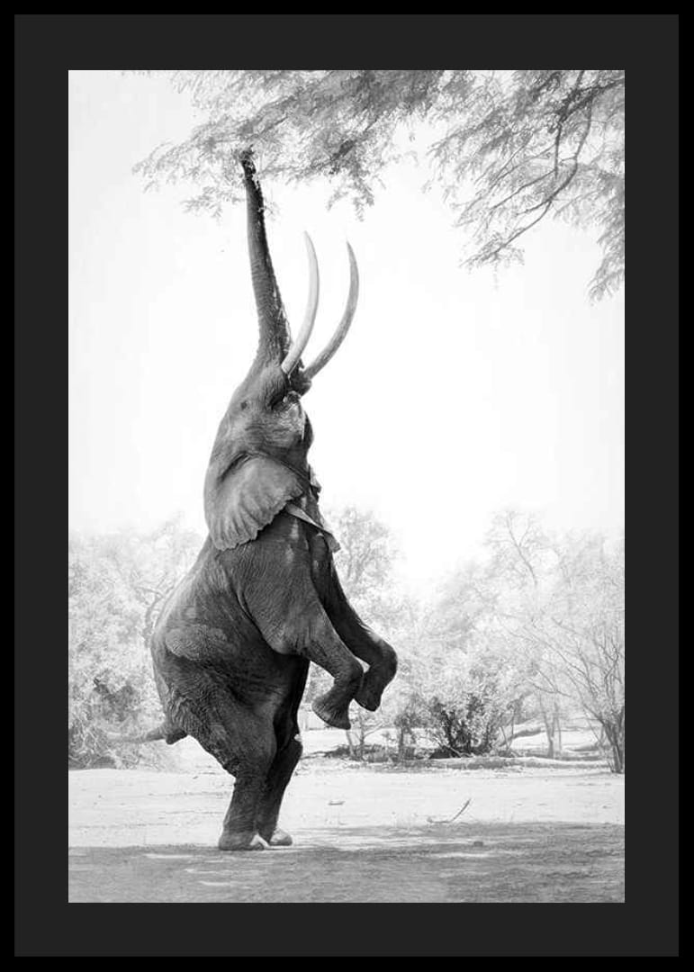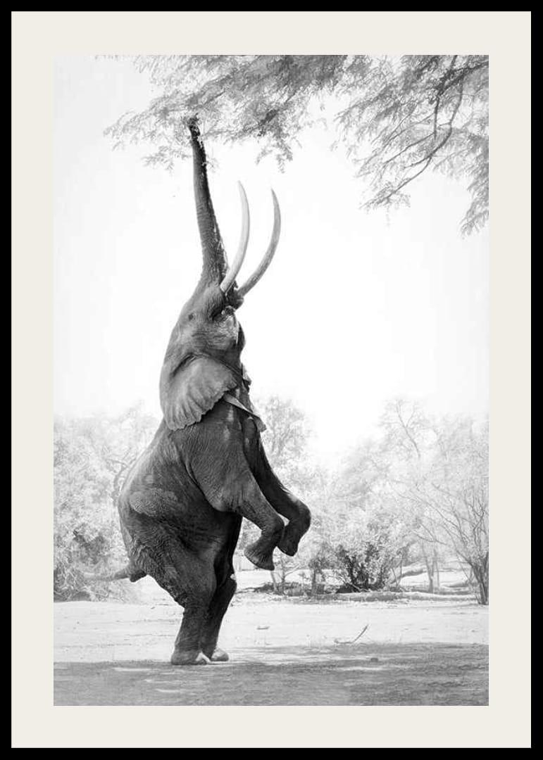 Slon stojí vzpriamene na zadných nohách a naťahuje chobot smerom k previsnutým konárom, aby dosiahol na lístie. Motív je čiernobielo vyfotografovaný so svetlým pozadím a jemnými detailmi v okolitej prírode. Tento plagát vytvára osobitý dojem a je vhodný do všetkého od obývacích izieb až po kancelárie.