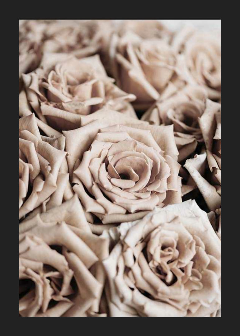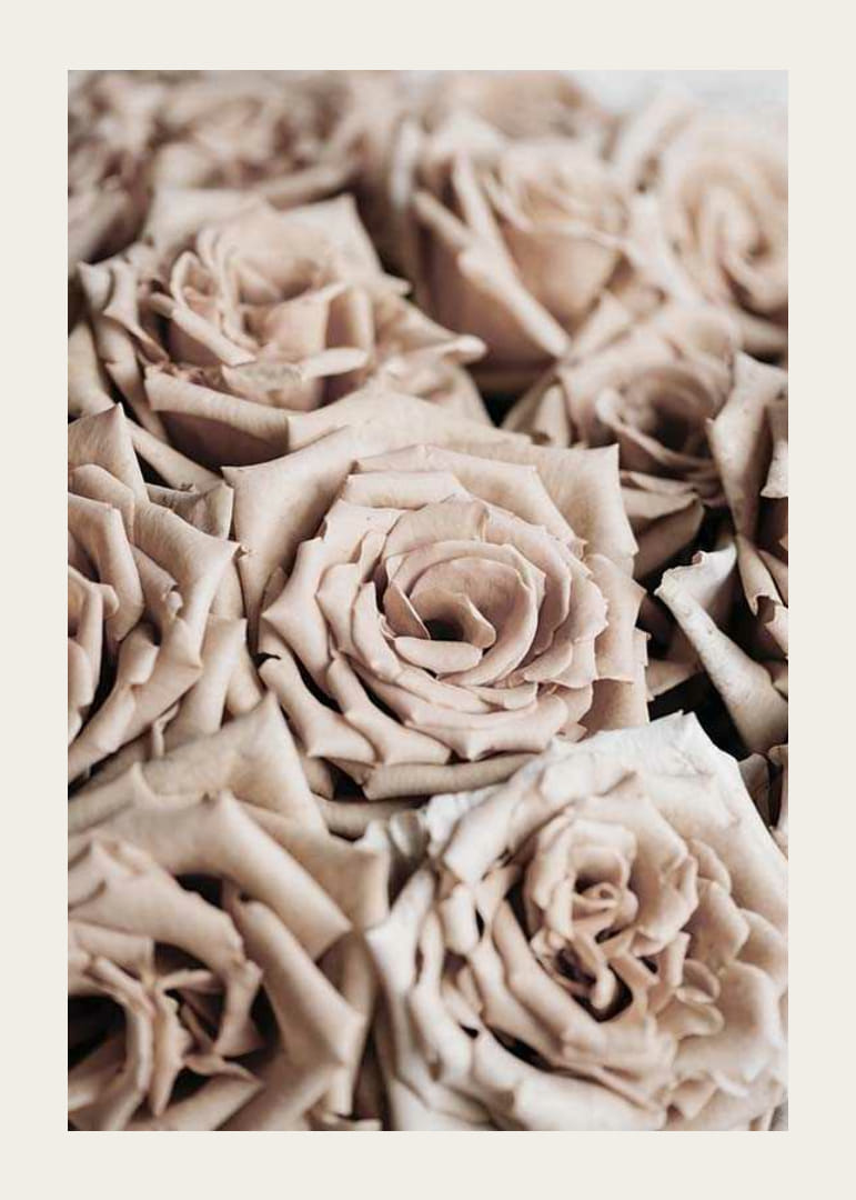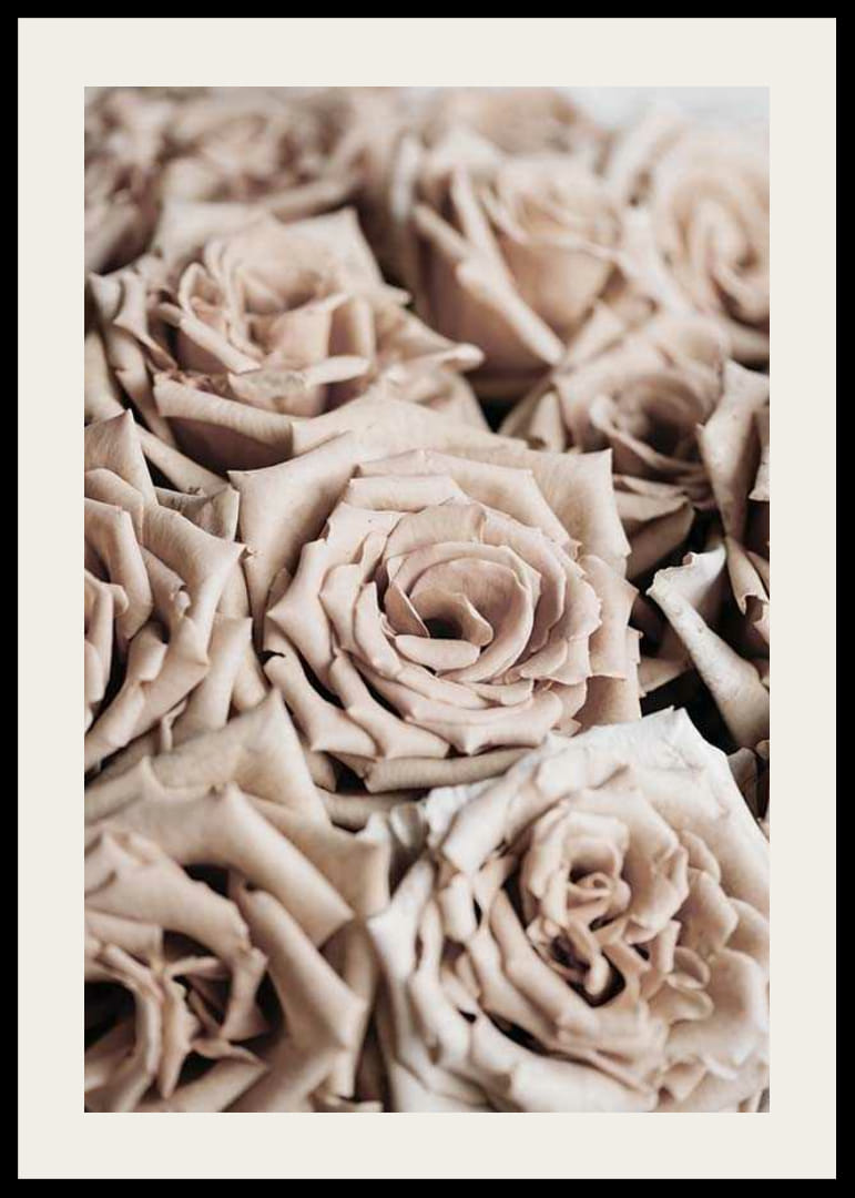 Detailný záber na husté ruže v tlmených béžových a púdrových odtieňoch. Okvetné lístky majú jemnú textúru a detaily v motíve jasne vynikajú, čím pôsobia pokojným a prirodzeným dojmom. Botanický plagát, ktorý dopĺňa teplé farby jesene a hodí sa rovnako dobre do obývačky ako aj do chodby alebo spálne.