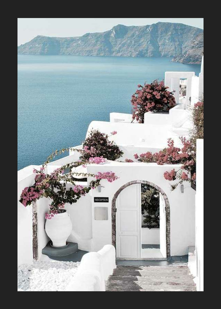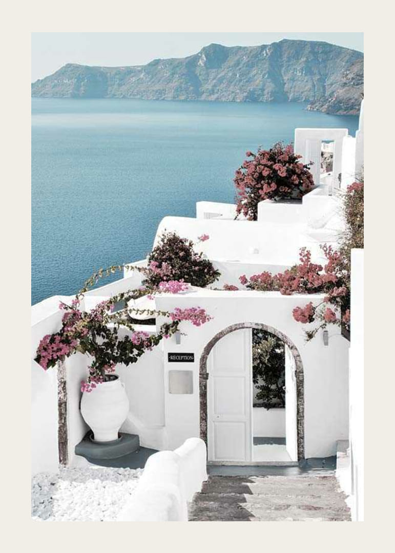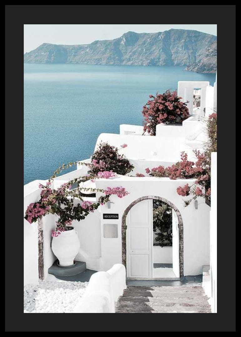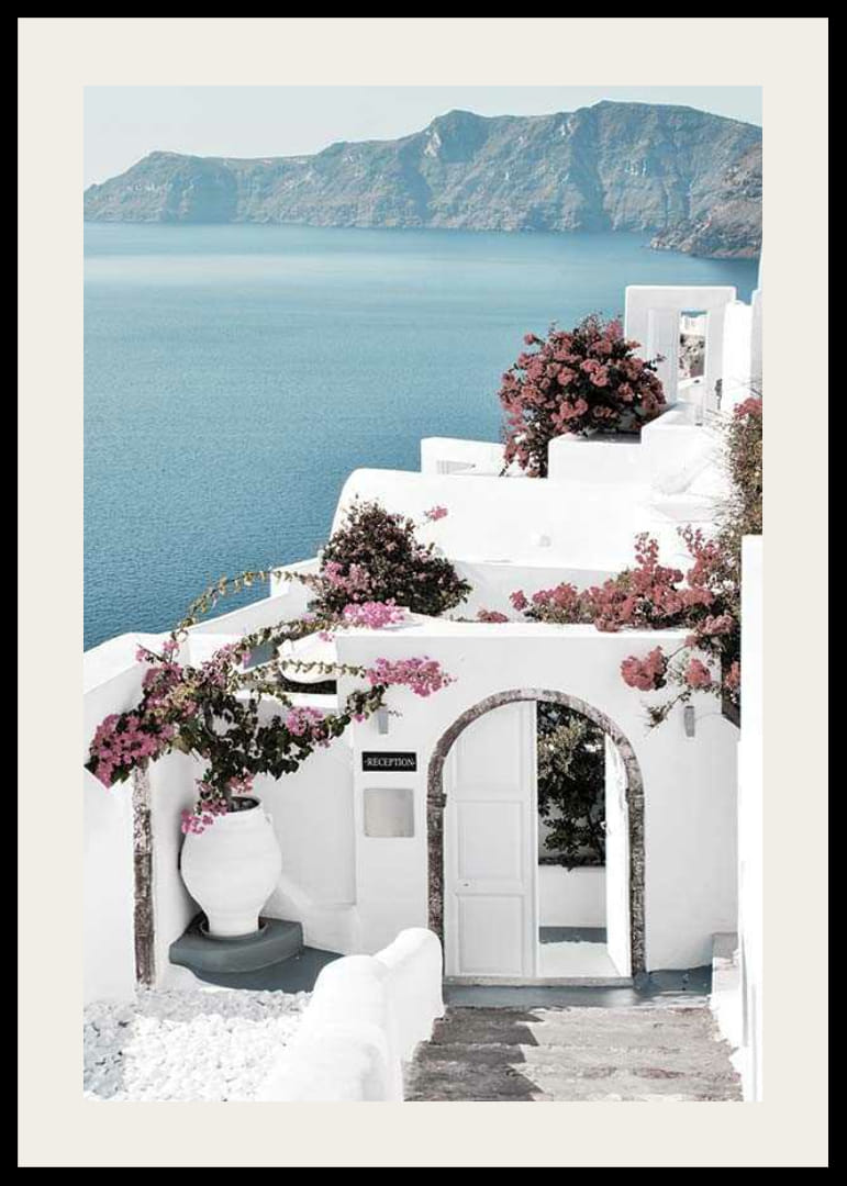 Tradičné biele budovy sa týčia na svahu gréckeho ostrova Santorini s výhľadom na tmavomodré Egejské more a hory v pozadí. Ružová bugenvília zdobí fasády a veľká urna označuje vchod pod klenutou bránou. Tento plagát dodáva stredomorský nádych a je vhodný do svetlého, vzdušného prostredia alebo letných miestností.