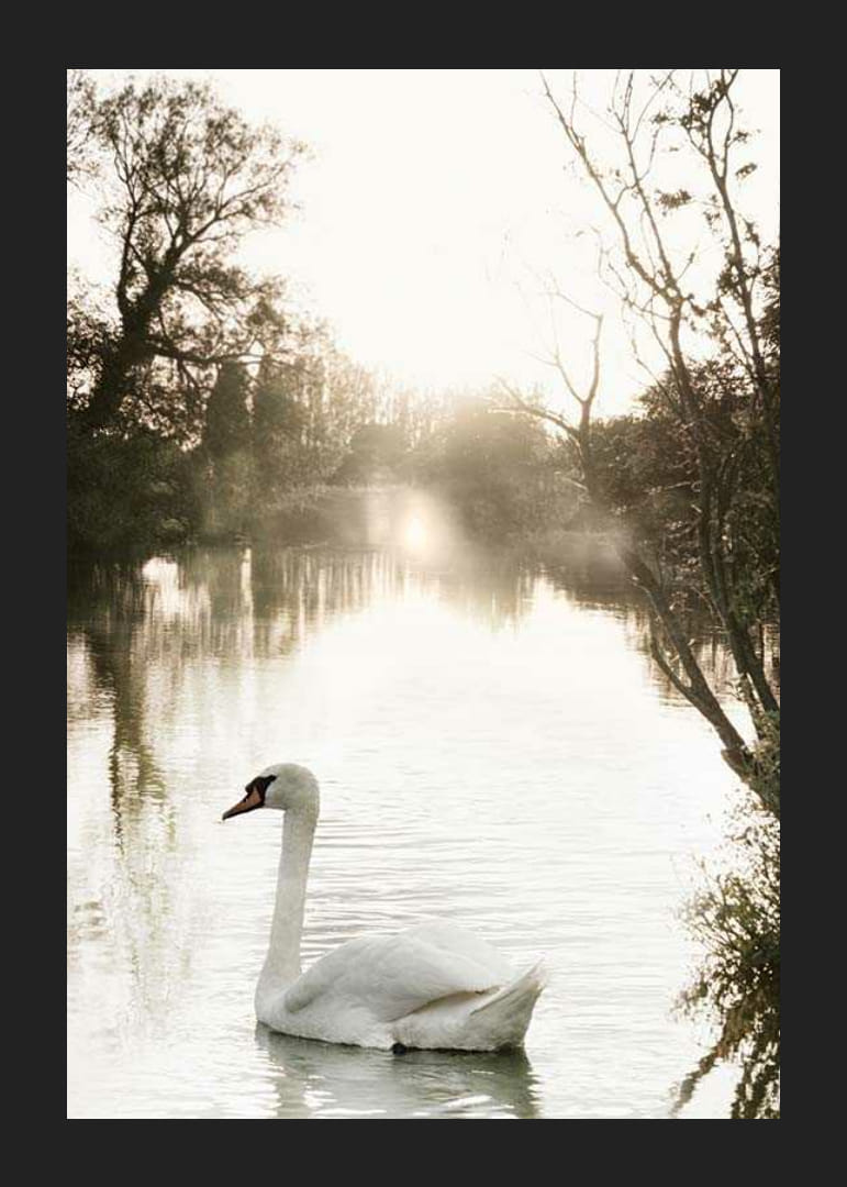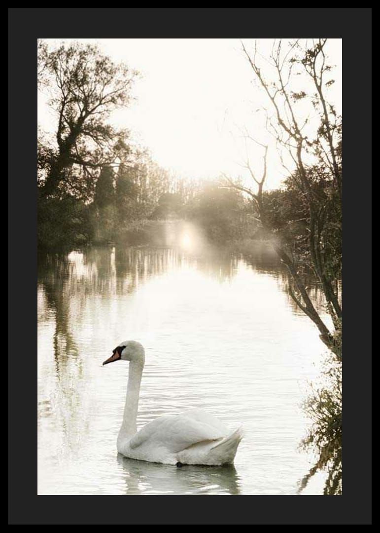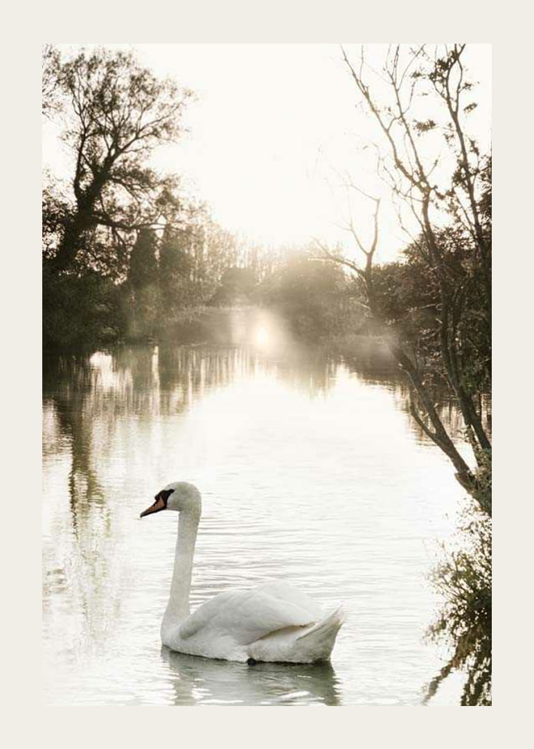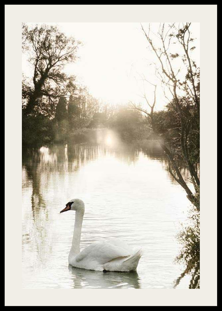 Labuť nemá sa pokojne kĺže po zrkadlovom jazere obklopenom konármi stromov a jemným protisvetlom vychádzajúceho slnka. Tóny prírody sú tlmené béžové a zelené, zatiaľ čo jemné svetlo dodáva motívu jemnú atmosféru. Tento plagát sa pekne hodí do obývačky alebo chodby, kde sú žiaduce motívy inšpirované prírodou.