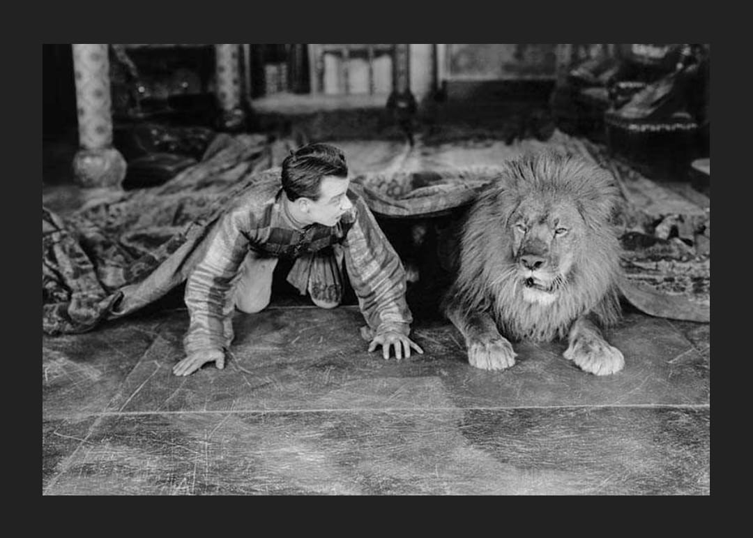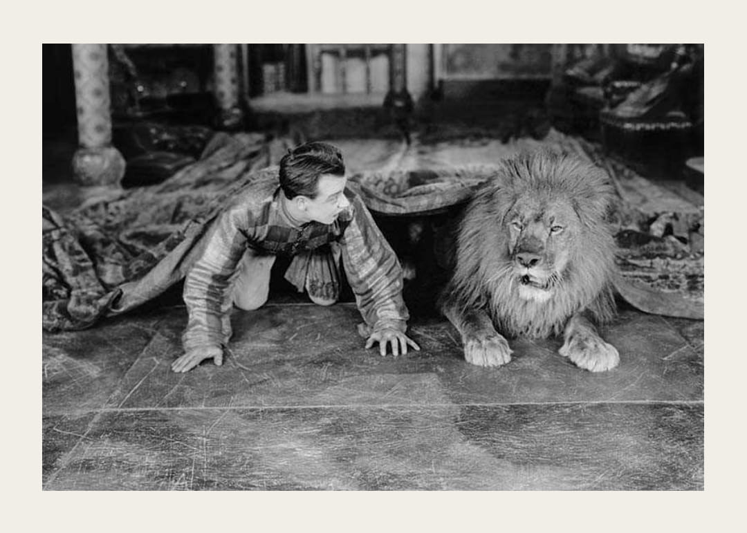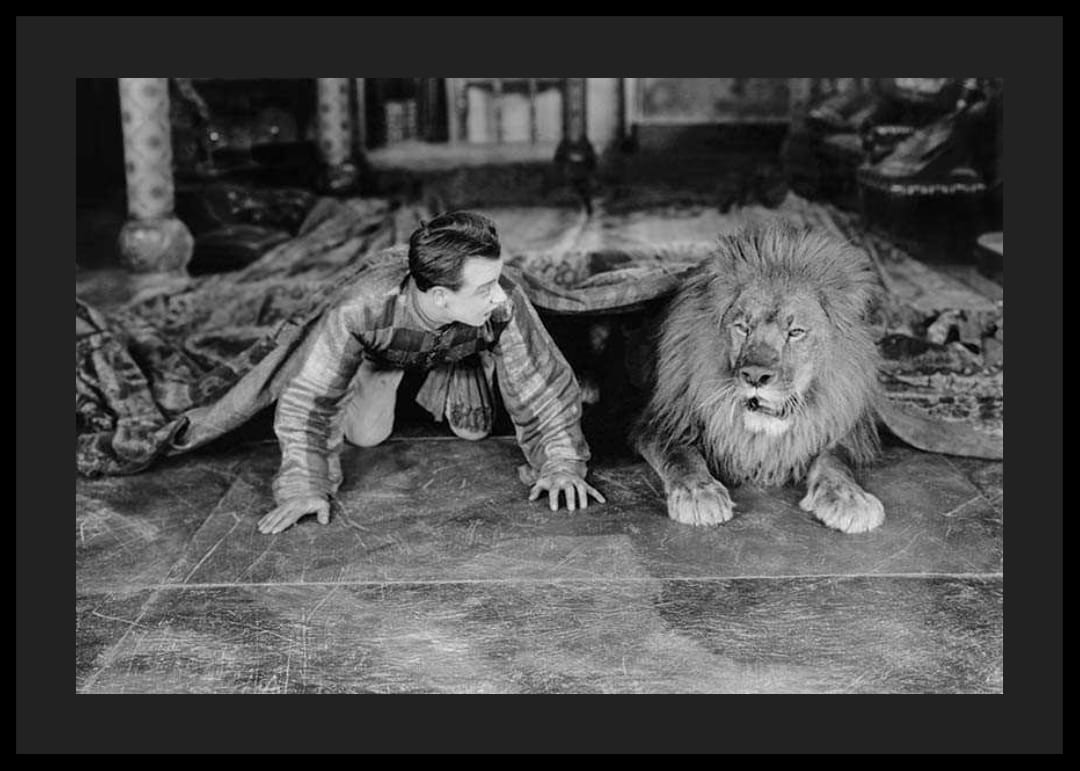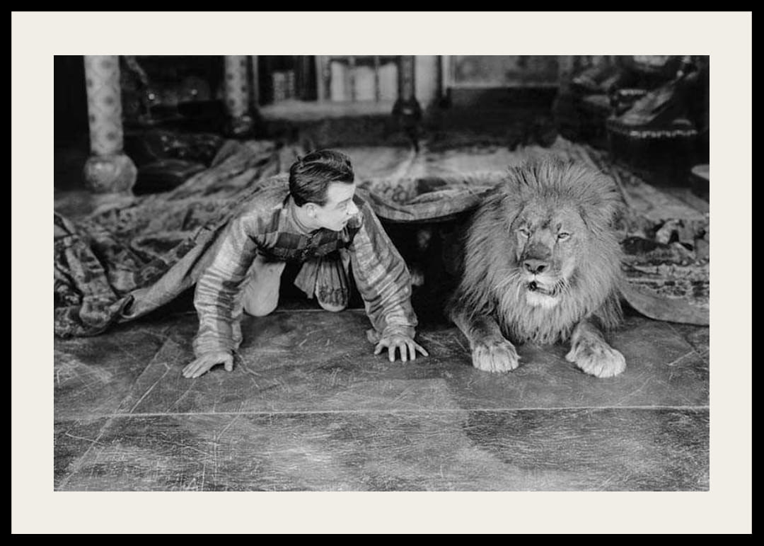 Mladý muž a lev ležia vedľa seba na dekoratívnej podlahe, obklopení vzorovanými látkami a nábytkom v klasickom štýle. Čiernobiely tón dodáva plagátu nadčasový nádych, kde je v centre pozornosti interakcia medzi človekom a zvieraťom. Plagát, ktorý dodá dramatickosť a charakter napríklad obývačke alebo pracovni.