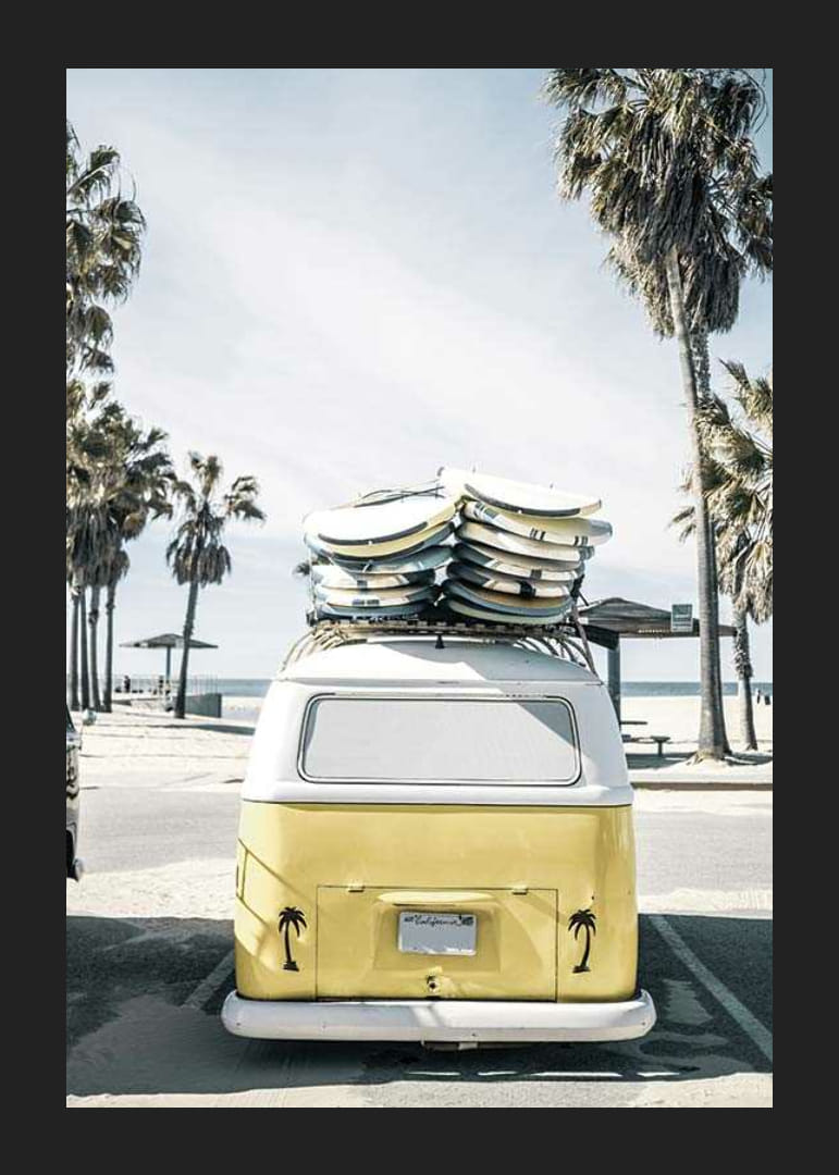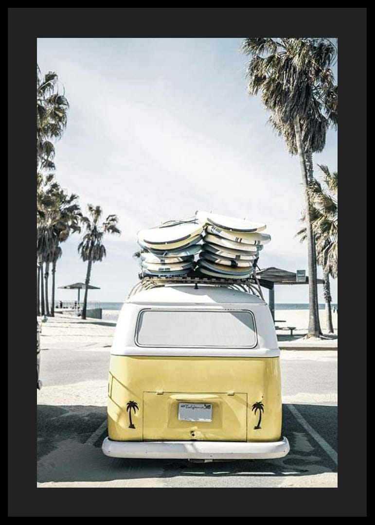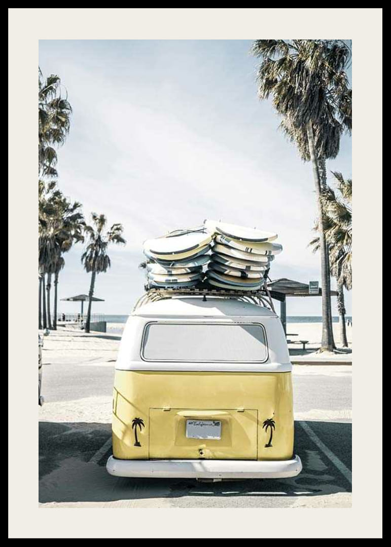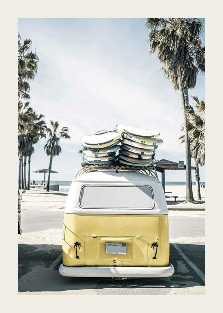 Zozadu je vidieť žltobiely autobus Volkswagen zaparkovaný na pláži Venice Beach, s kopou surfových dosiek na streche a palmami všade naokolo. Motív charakterizuje svetlomodrá obloha a uvoľnené prostredie pláže. Tento plagát jasne vystihuje letný život a surferskú kultúru a je ideálny do miestností, kde je žiaduca neformálna atmosféra.