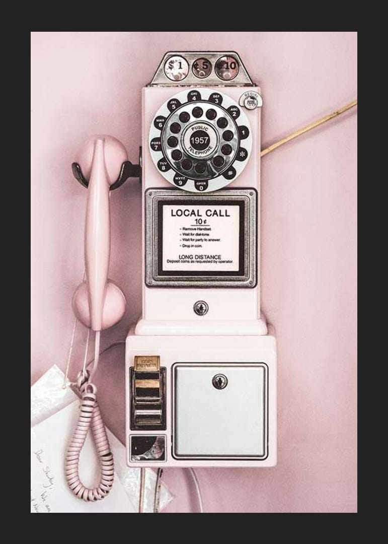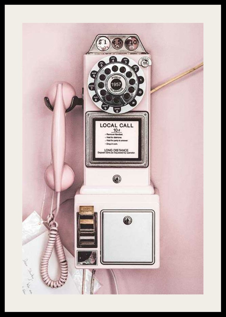 Ružový telefónny automat z 50. rokov 20. storočia s čiernym ciferníkom, priehradkou na mince a špirálovou šnúrkou na svetloružovom pozadí. Jasné detaily, ako sú kovové ceduľky a priehradka na mince, umocňujú nostalgický nádych motívu. Vďaka retro štýlu dodá tento plagát osobný nádych chodbe, kuchyni alebo pracovni.