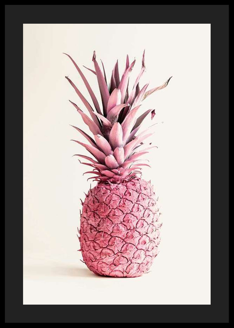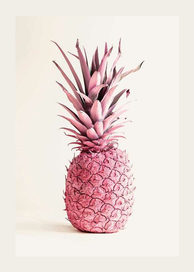Detailný záber na ananás so šupkou aj listami v odtieňoch ružovej. Motív je umiestnený na svetlom, takmer bielom pozadí, ktoré zvýrazňuje textúru ovocia a neočakávanú farebnú schému. Tento plagát, hravý doplnok do kuchyne alebo jedálne, prináša do vášho interiéru moderný a farebný výraz.