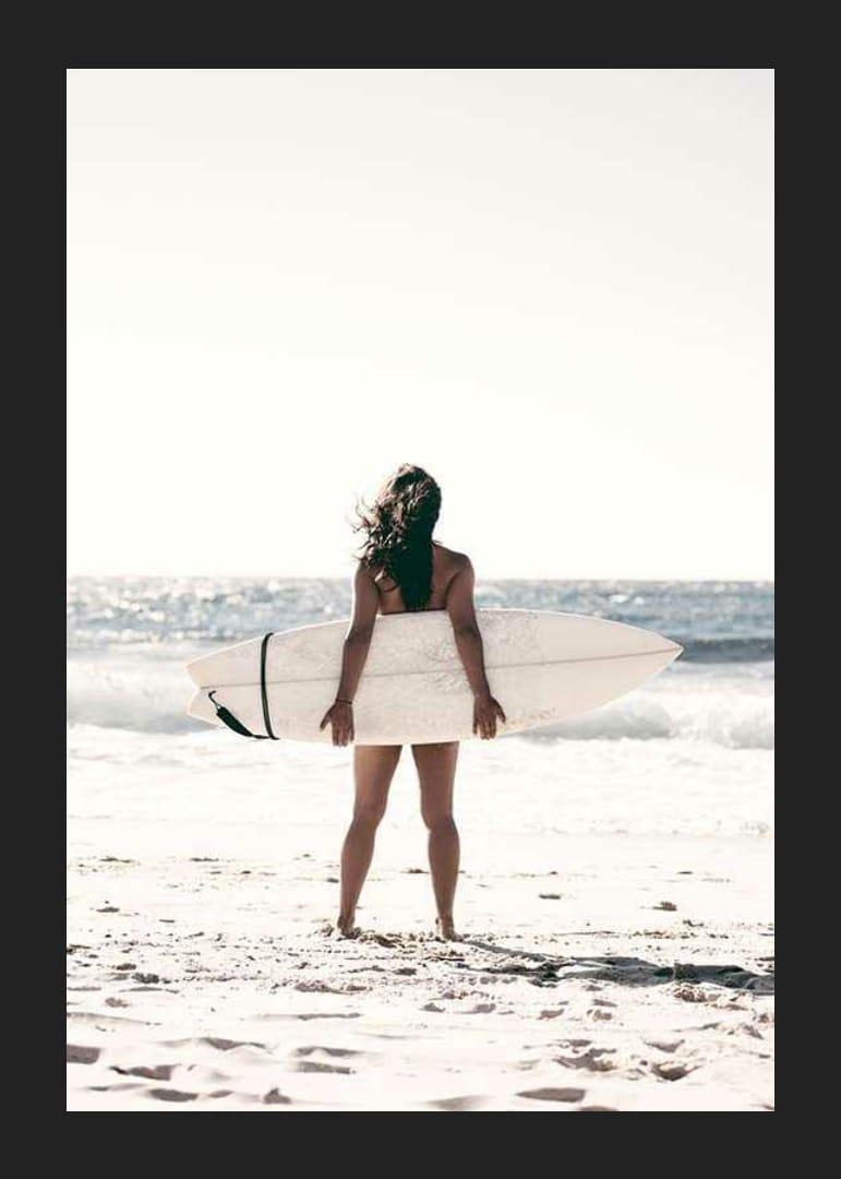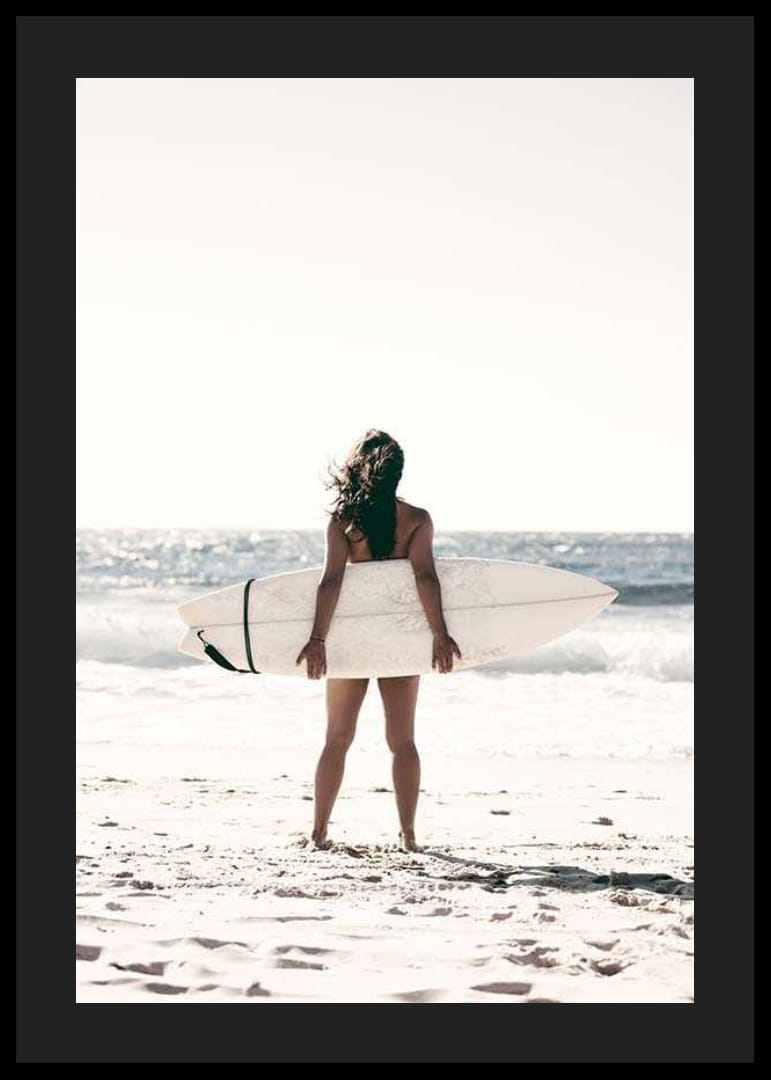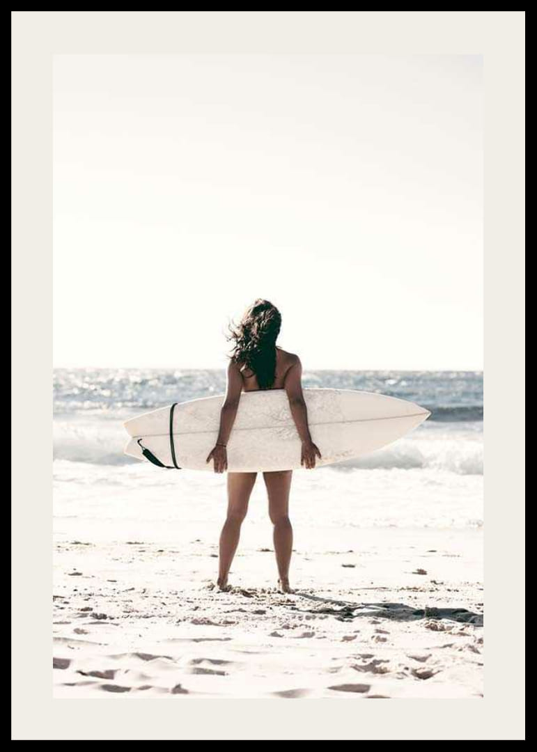 Mladá žena stojí chrbtom k fotoaparátu a pod pazuchou drží veľký biely surf. Piesočnatá pláž sa tiahne až k trblietavému moru, kde sa vlny valia pod jasnou oblohou. Chladné tóny a otvorené svetlo dodávajú fotografovanej osobe ležérny nádych. Tento plagát prispieva k letnej a uvoľnenej atmosfére v domácnosti.