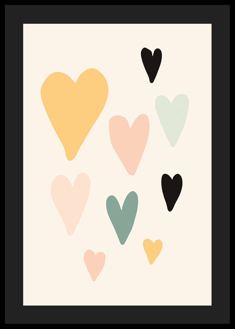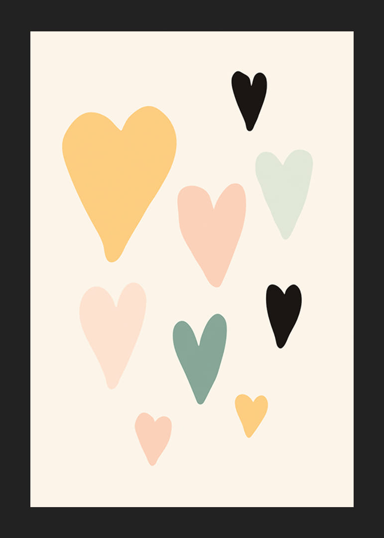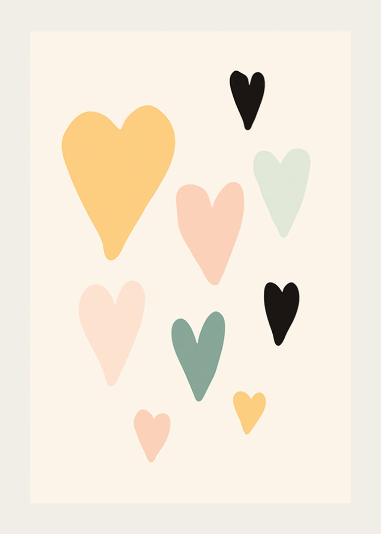 Motív pozostáva z deviatich ilustrovaných srdiečok rôznych veľkostí umiestnených na svetlobéžovom pozadí. Srdcia v jemných pastelových tónoch, ako je žltá, ružová, zelená a čierna, dodávajú plagátu hravý a prívetivý výraz. Tento plagát prispieva k hrejivému a hravému pocitu a pekne sa hodí do detských izieb alebo kreatívnych prostredí.