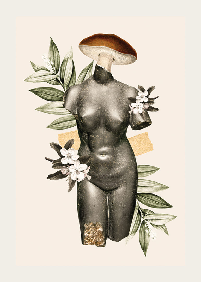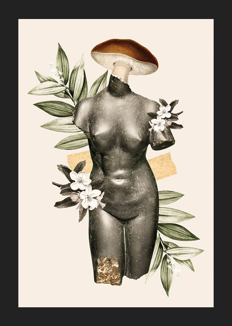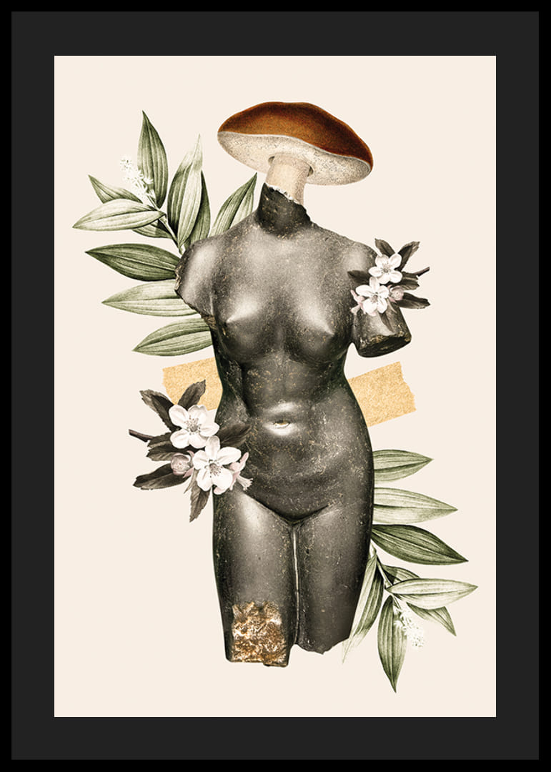 Starožitná ženská socha trupu z tmavého kameňa je tu kombinovaná s ilustráciami zelených listov, bielych kvetov a klobúka huby ako hlavy. Motív na svetlom pieskovo sfarbenom pozadí dostáva hravý a moderný nádych. Tento plagát je vhodný do kreatívnych pracovných priestorov aj spoločenských priestorov, kde chcete zvýrazniť umelecké prvky.