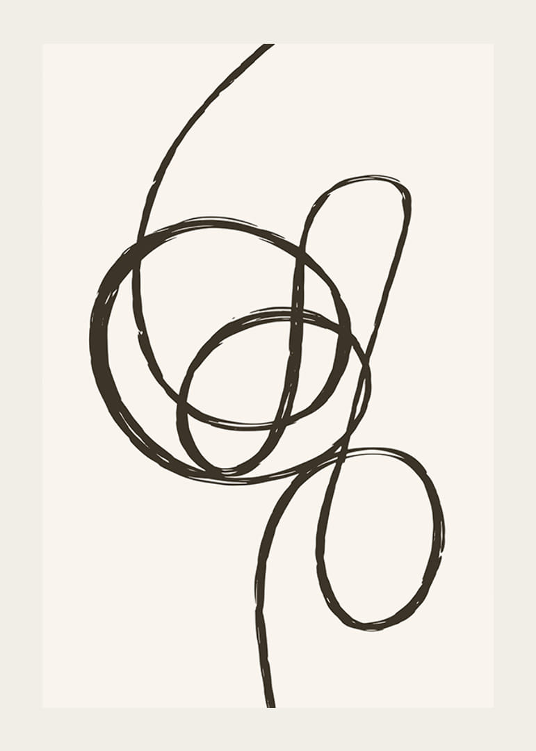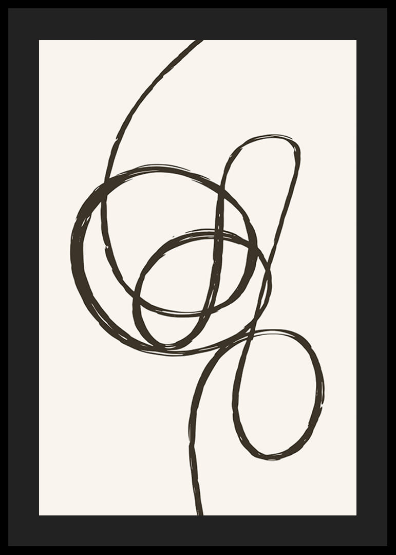Motív s čiernou kontúrovou čiarou, ktorá sa vinie v otvorenom, abstraktnom uzlovitom tvare na svetlobéžovom pozadí. Jednoduchá a organická kompozícia čiar dodáva plagátu moderný vzhľad, ktorý sa hodí do obývačky aj kancelárie. Štýlové riešenie pre tých, ktorí chcú na stene vytvoriť grafický výraz.