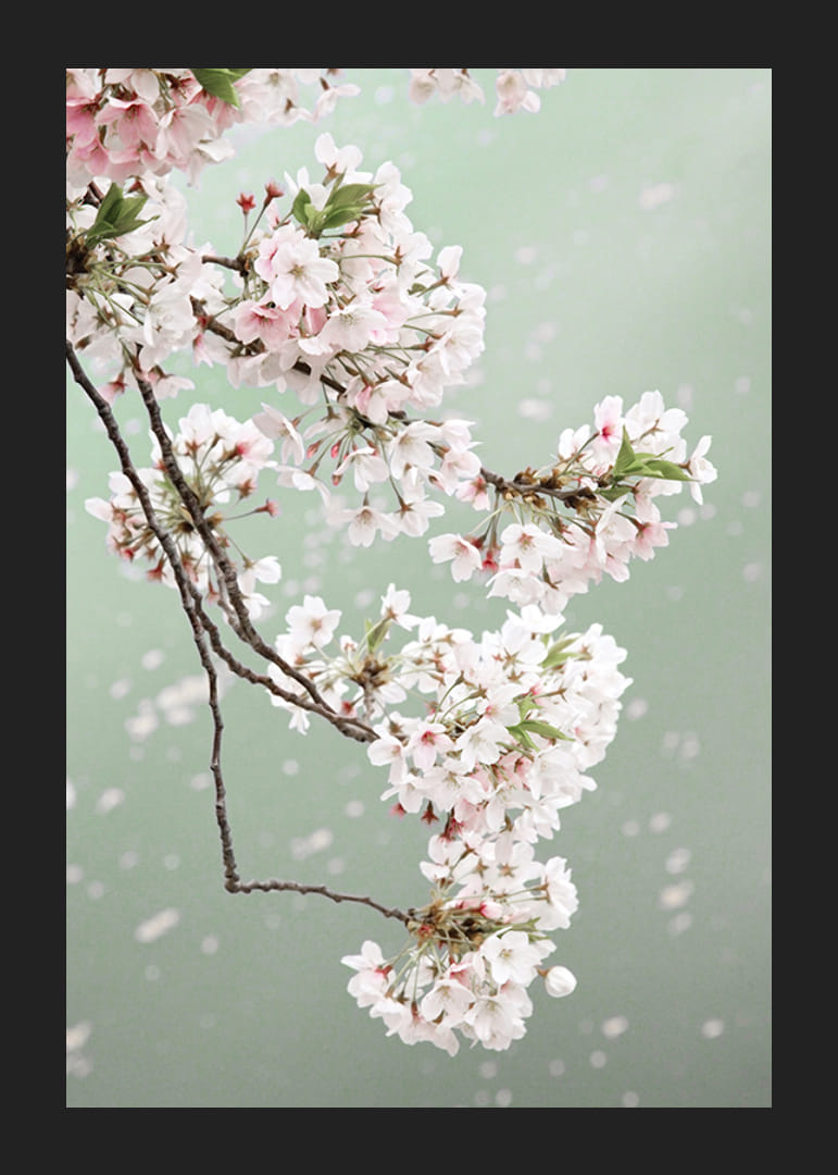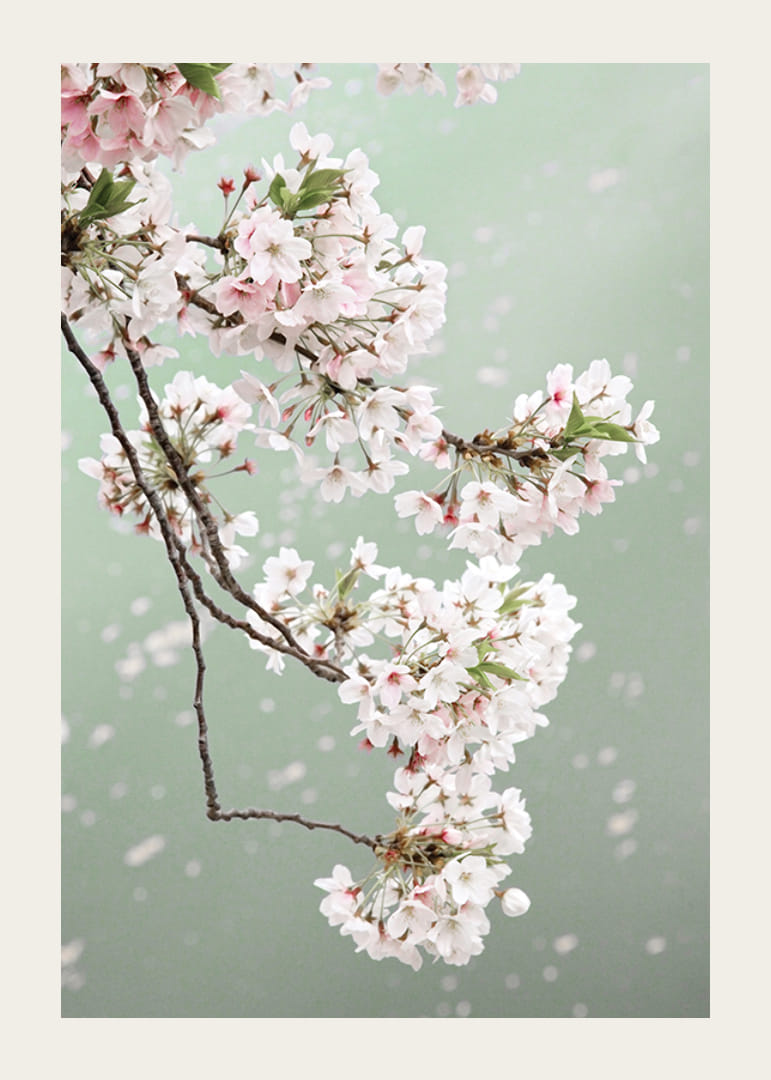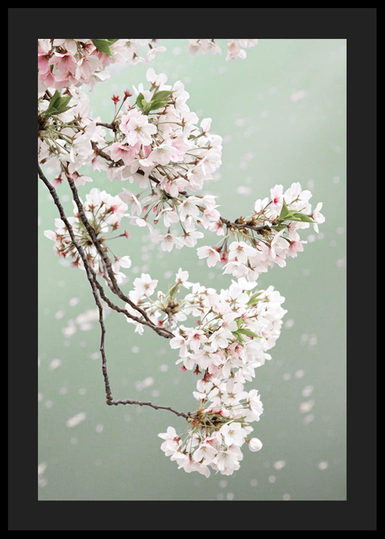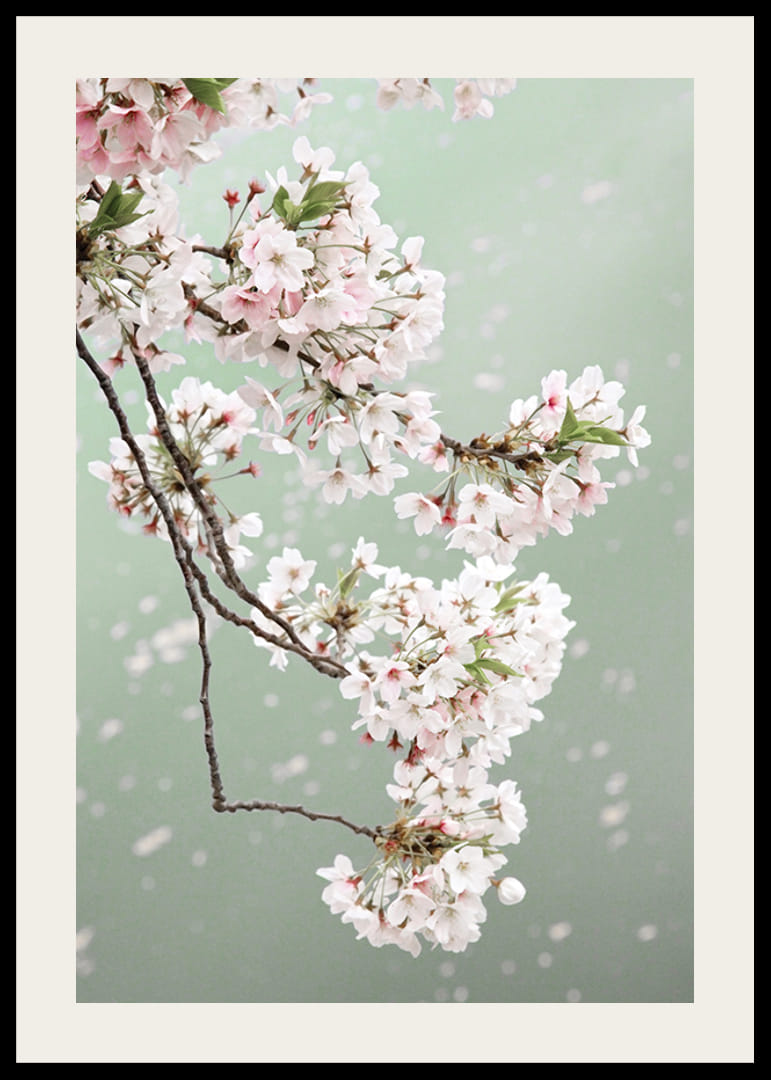 Konáre čerešní sú pokryté bledoružovými kvetmi a malými zelenými listami, zachytenými na fotografickom detaile na jemne rozostrenom zelenom pozadí. Padajúce okvetné lístky prispievajú k motívu jarnou atmosférou. Tento plagát sa skvele hodí do domácností, ktoré potrebujú svieži, sezónny detail v obývačke, spálni alebo na chodbe.