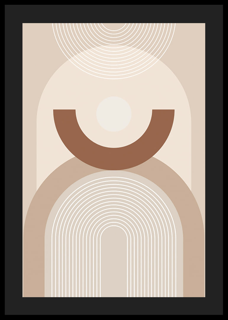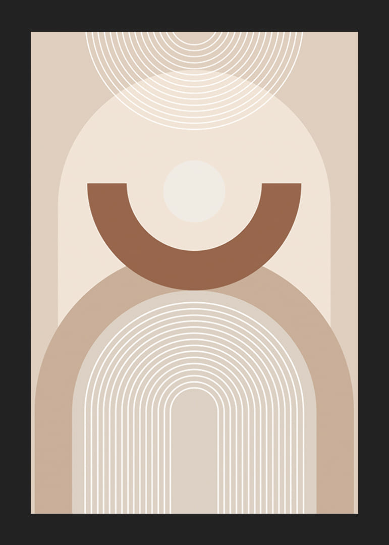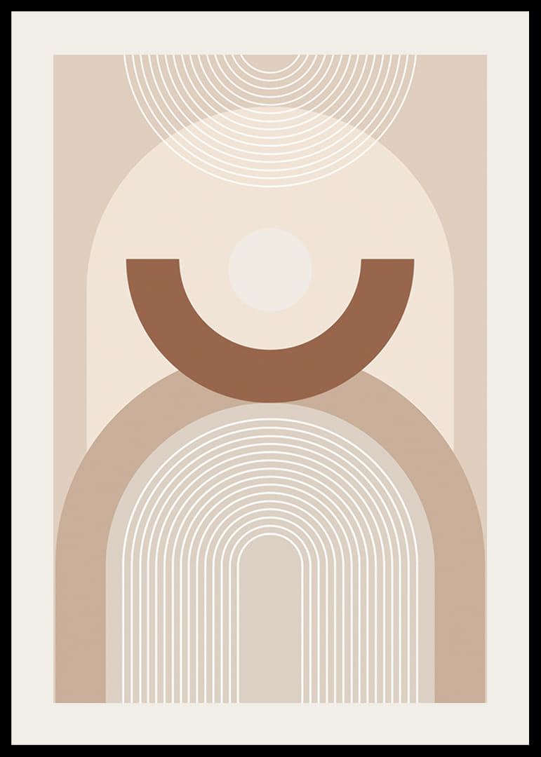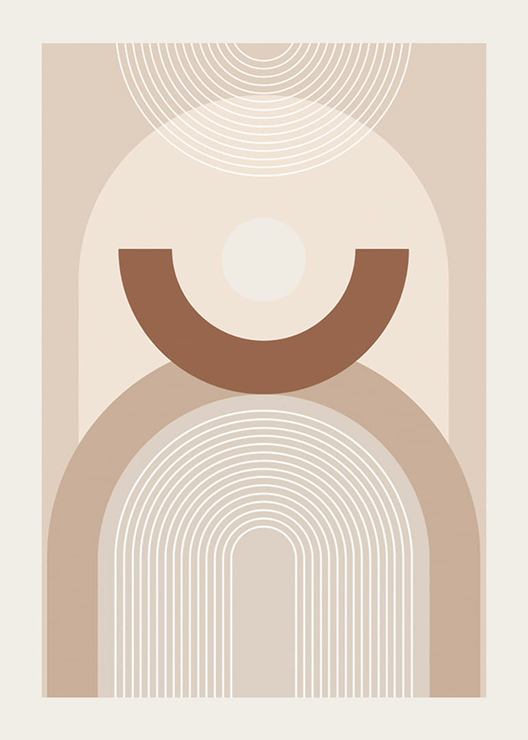Motív pozostáva z oblúkovitých čiar, kruhov a polkruhov rôznych veľkostí, usporiadaných v symetrickom vzore na svetlobéžovom pozadí. Farebná paleta je v teplých a tlmených tónoch béžovej a hnedej, čo plagátu dodáva grafický a štýlový nádych. Vhodný do moderných a minimalistických interiérov.