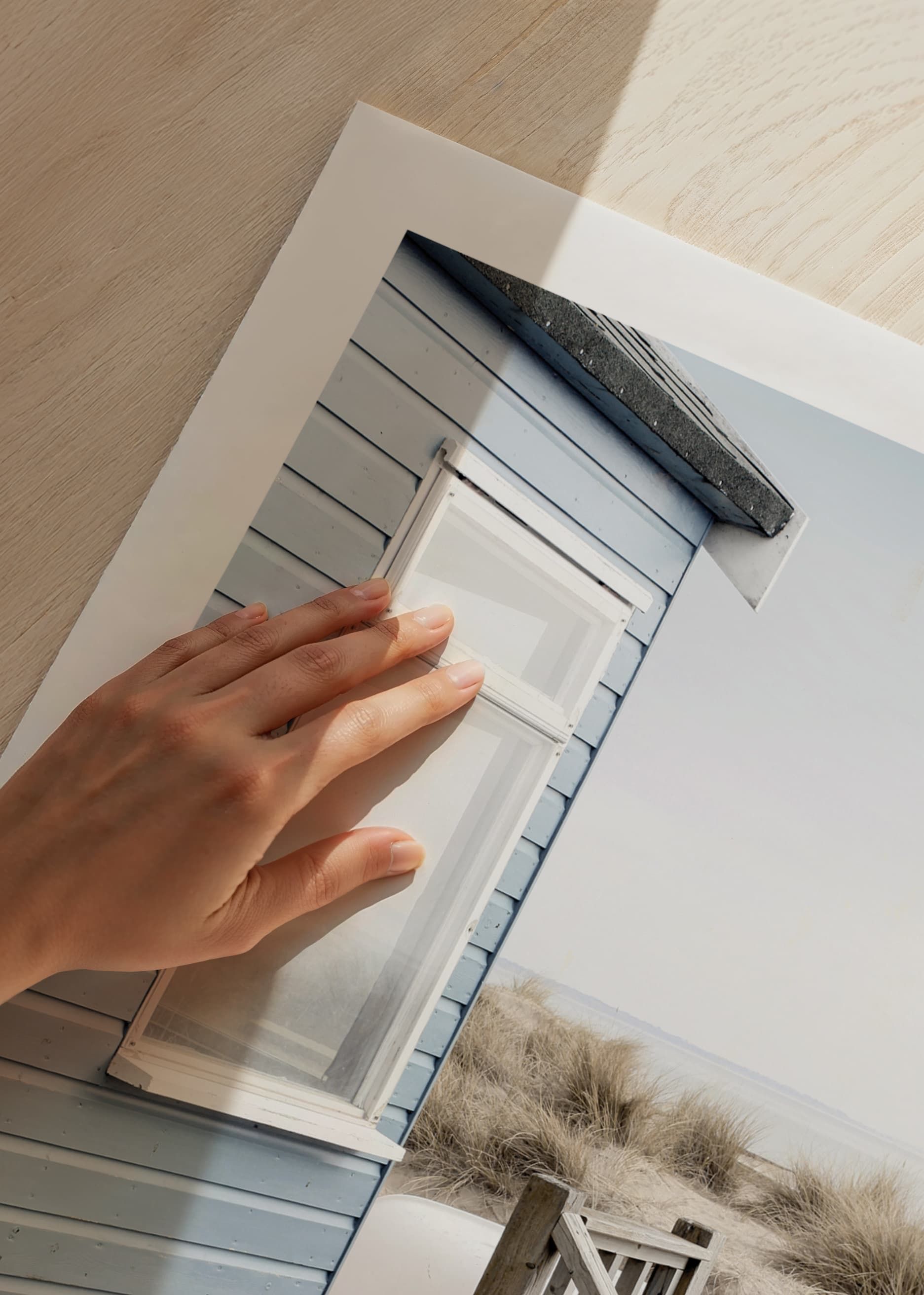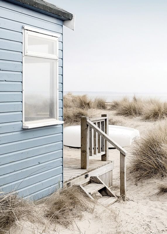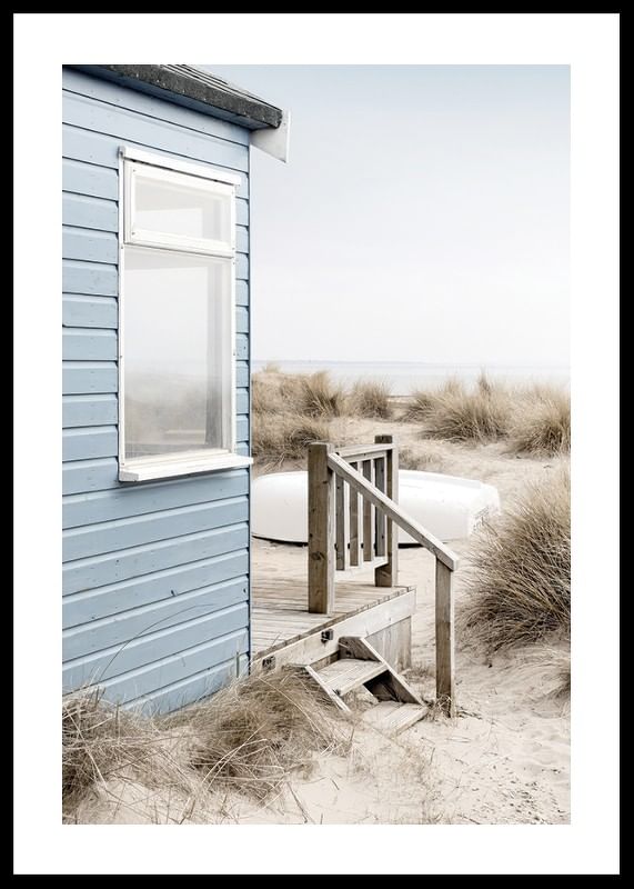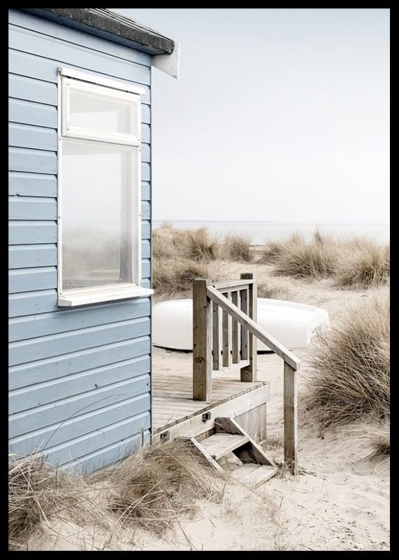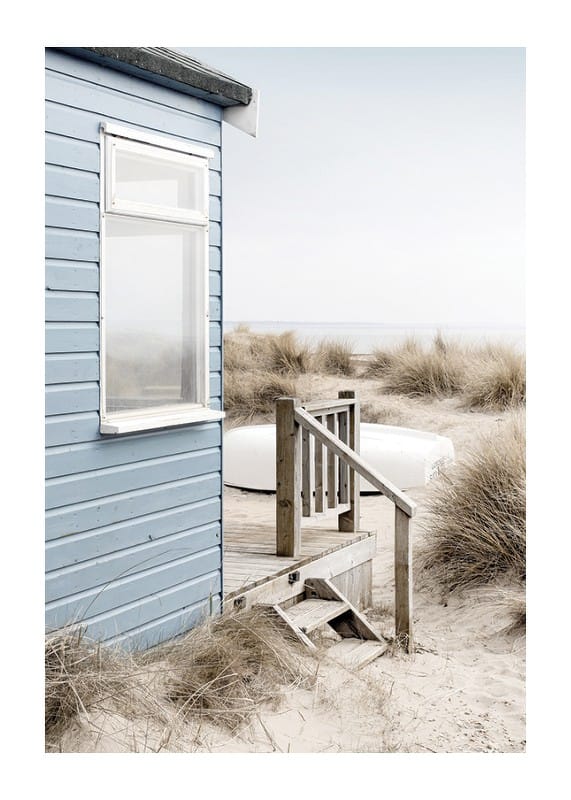 Svetlomodrý plážový dom s dreveným schodiskom stojí pri dunách pokrytých suchou plážovou trávou. V pozadí je viditeľný biely dub a more pod bledomodrou oblohou. Jemné, chladné tóny dodávajú vzdušný pocit. Tento plagát je skvelý do miestností, kde sa cení jemná letná atmosféra a prírodná atmosféra.