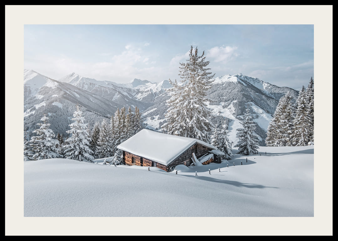Zasnežené jedle obklopujú malú drevenú chatku ukrytú v nedotknutom bielom snehu. V pozadí je pod svetlomodrou oblohou vidieť niekoľko vysokých hôr s jemnými kontúrami. Studené tóny a jasné kontrasty vytvárajú zimný a pokojný výraz. Tento plagát dodáva chladný a vzdušný nádych domovom v modernom alebo klasickom štýle.